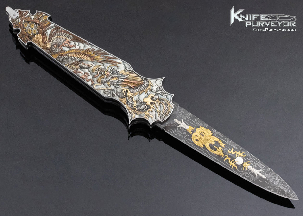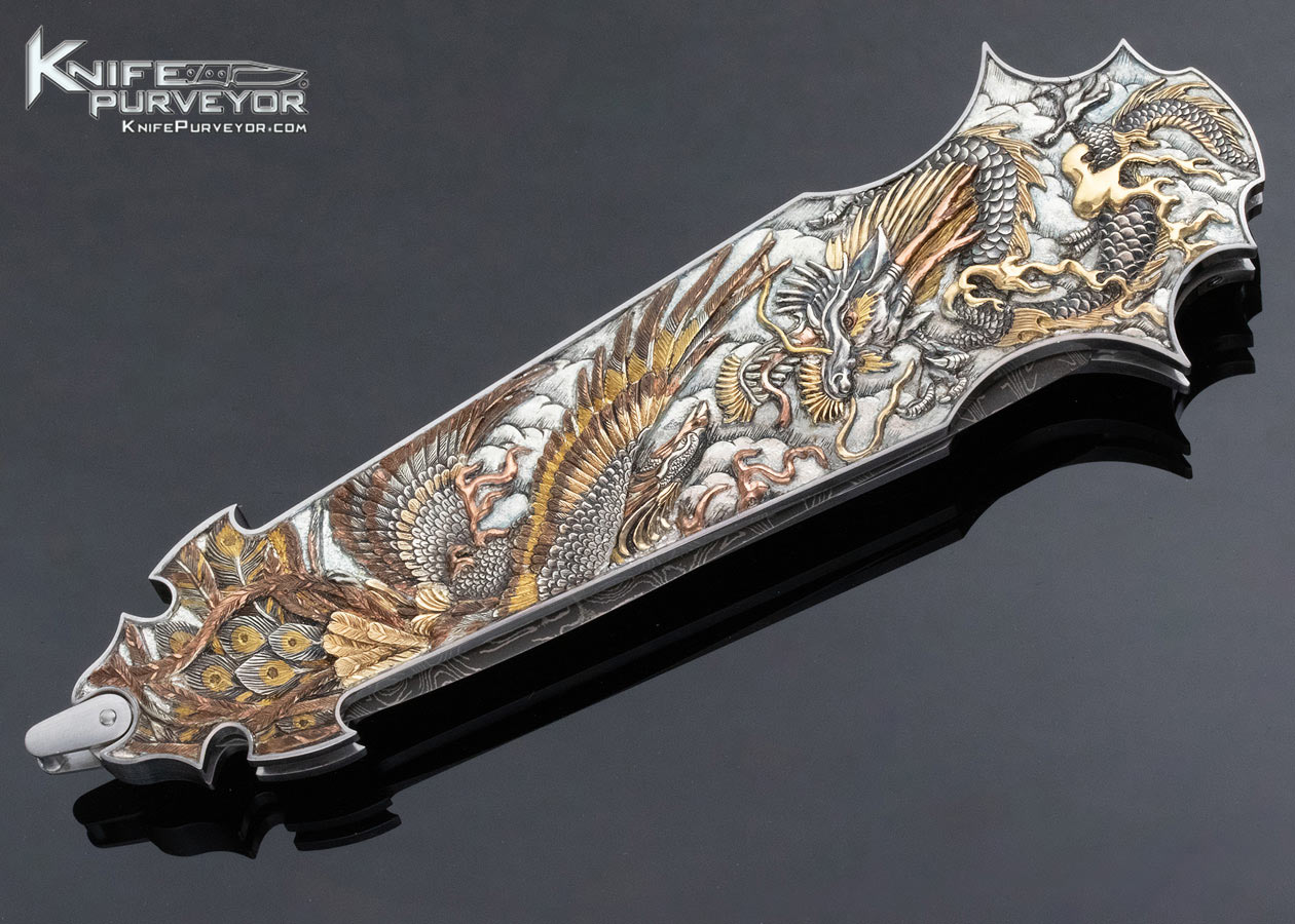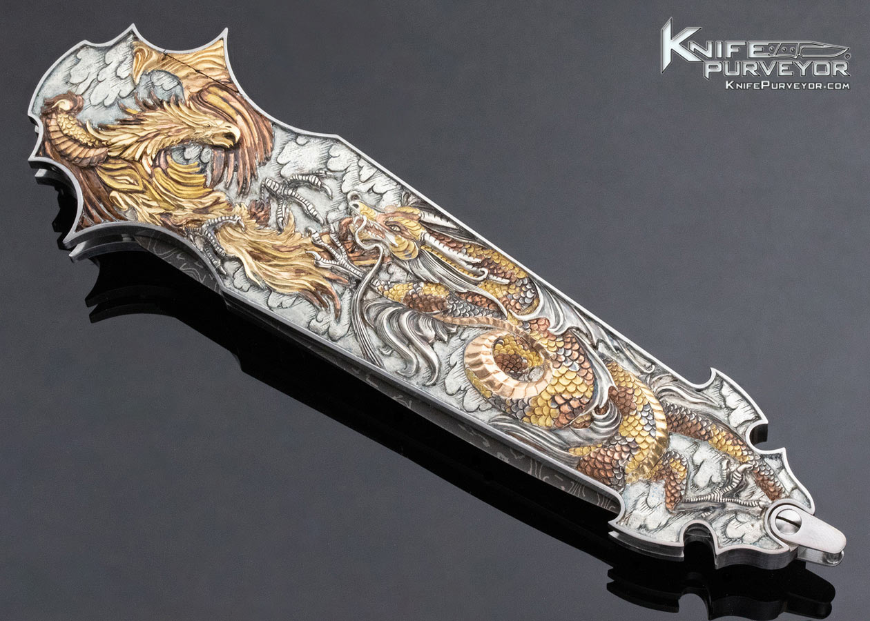 Alex Gev has done a superb job with this dragon and phoenix themed hidden release auto that is among his very best folders. His unique hidden frame lock not only fires the blade, it also releases the blade lock. The deep carving and build up work are at a level that few others can match with inlays of yellow, red, and green gold. The detail of all the individually inlaid and carved scales on the dragon and feathers of the phoenix alone are enough to boggle the mind. The gold and platinum inlaid blade repeats the dragon and phoenix theme and is just as impressive as the rest of this work of art. As Alex is both the maker and the engraver, he is able to create a perfect package. This is a large knife yet it is in no way a bulky or chunky knife, quite the opposite. It is a pleasure to hold in the hand. It comes with a blue felt case made in the shape of a book to store and present his masterpiece. A true sole authorship work of art from the "Art Master" himself.