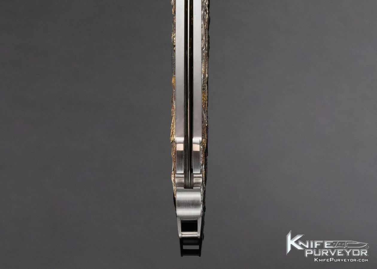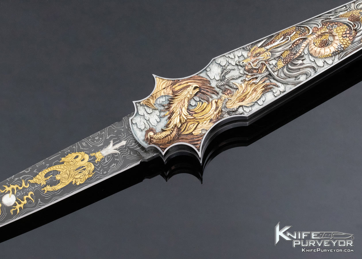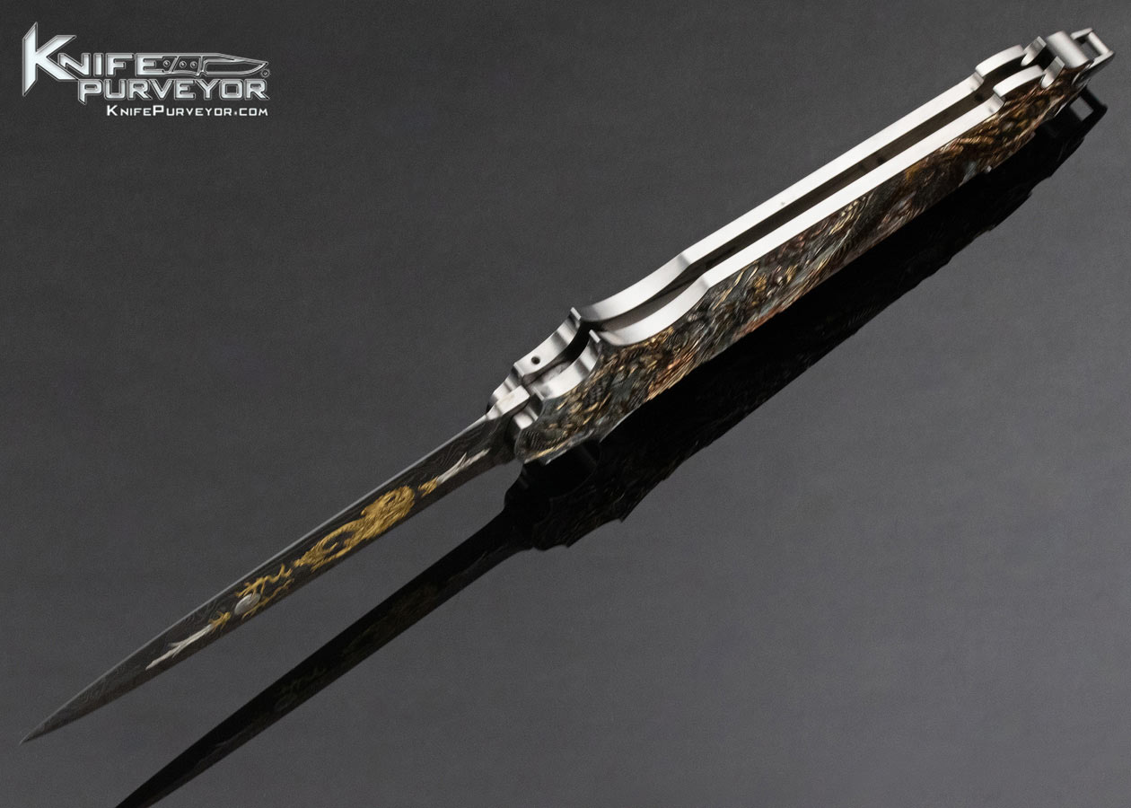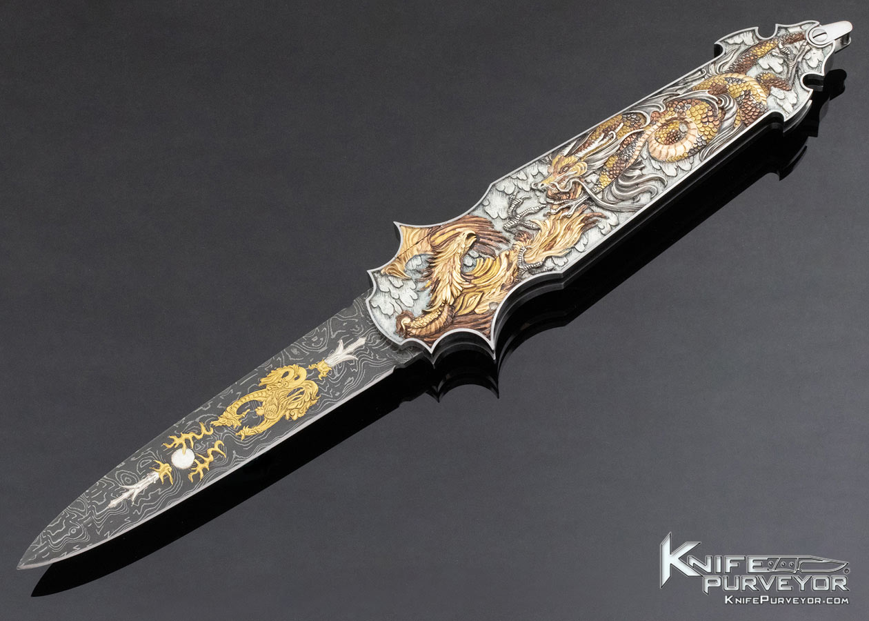 Alex Gev has done a superb job with this dragon and phoenix themed hidden release auto that is among his very best folders. His unique hidden frame lock not only fires the blade, it also releases the blade lock. The deep carving and build up work are at a level that few others can match with inlays of yellow, red, and green gold. The detail of all the individually inlaid and carved scales on the dragon and feathers of the phoenix alone are enough to boggle the mind. The gold and platinum inlaid blade repeats the dragon and phoenix theme and is just as impressive as the rest of this work of art. As Alex is both the maker and the engraver, he is able to create a perfect package. This is a large knife yet it is in no way a bulky or chunky knife, quite the opposite. It is a pleasure to hold in the hand. It comes with a blue felt case made in the shape of a book to store and present his masterpiece. A true sole authorship work of art from the "Art Master" himself.