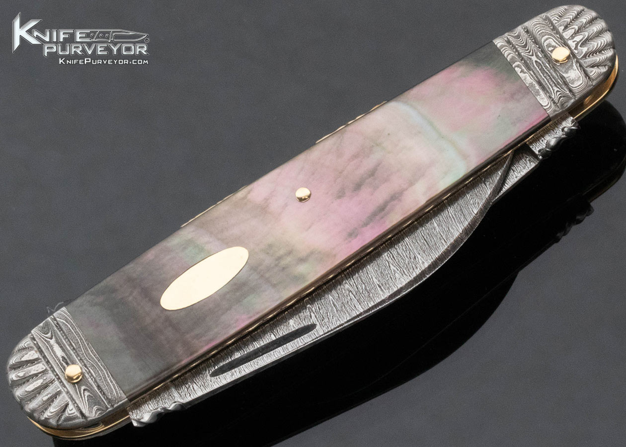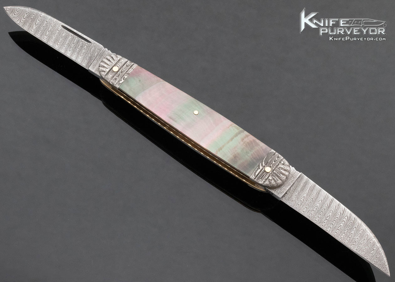 Barry Davis Custom Knife Sole Authorship Damascus 14Kt Gold Liners, Pins and Escutcheon Black Lip Tahitian Pearl Shell Double Lockback