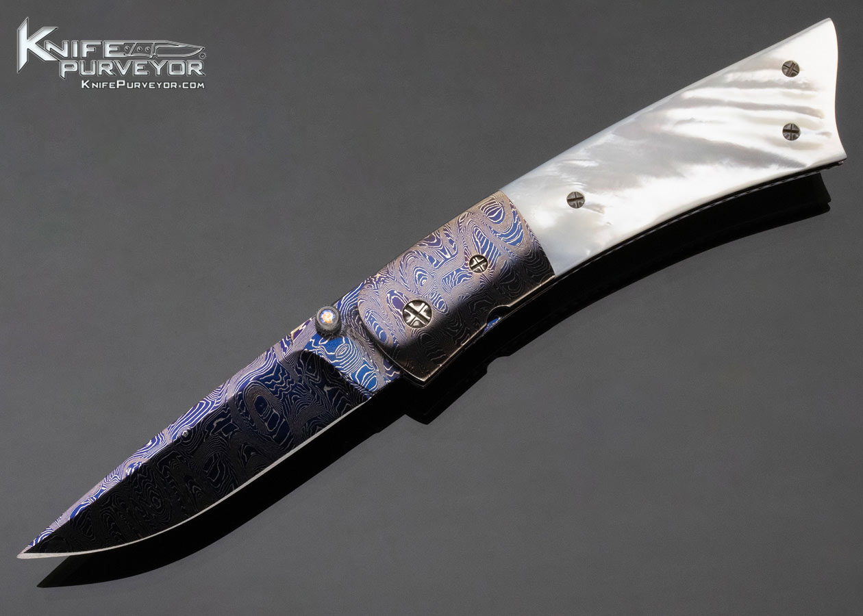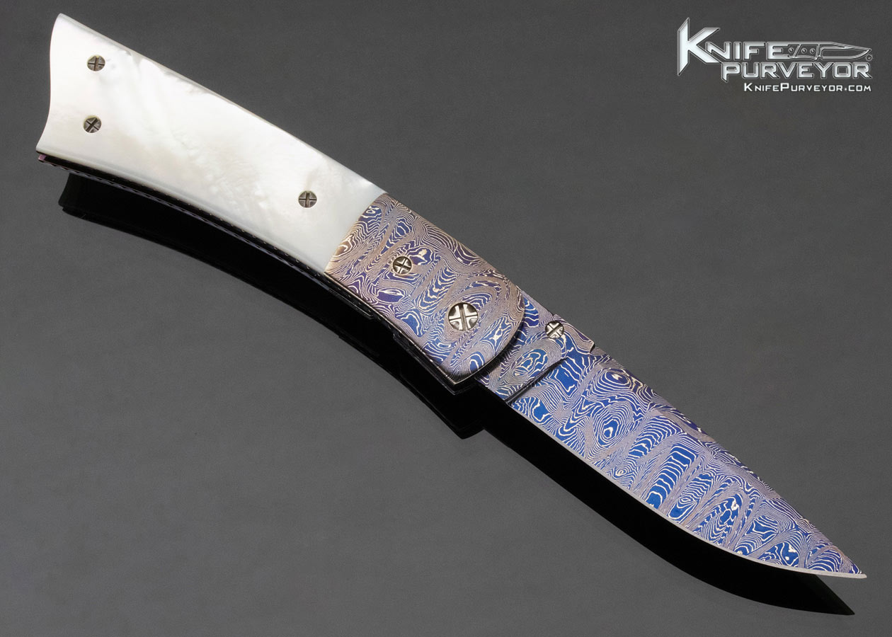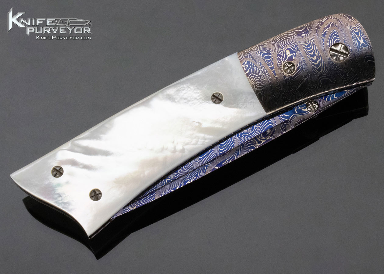 Barry Gallagher Custom Knife Blued Sole Authorship Damascus and Pearl Linerlock