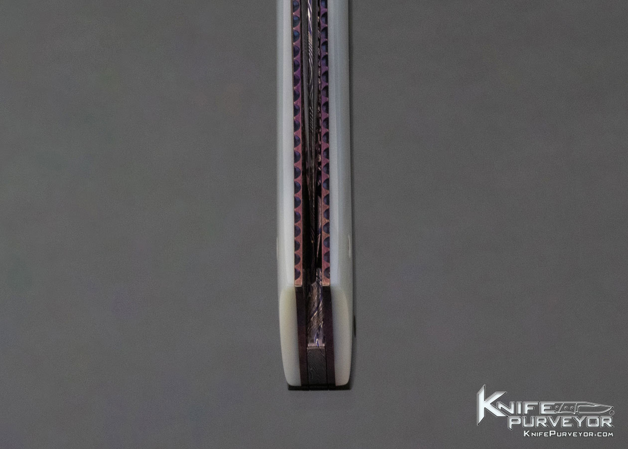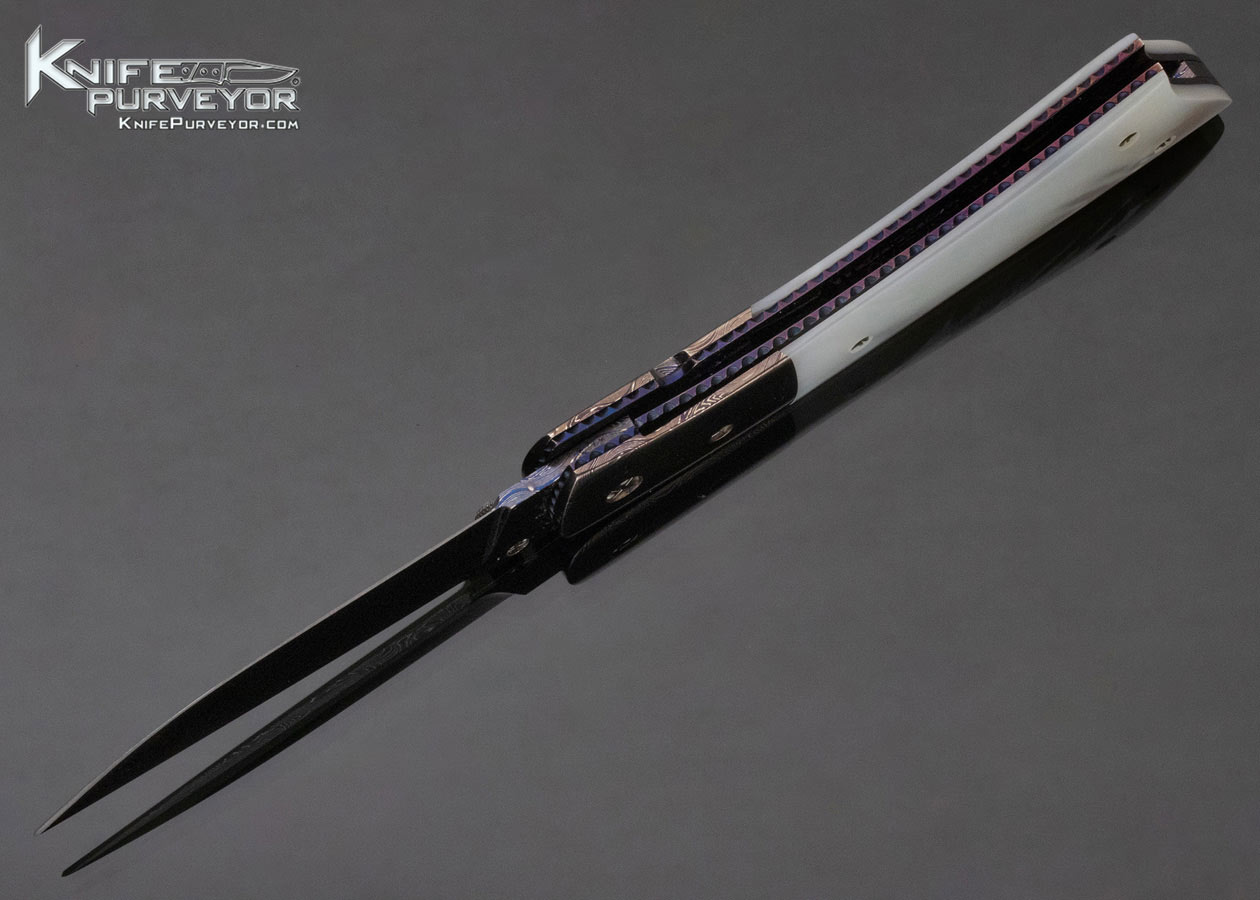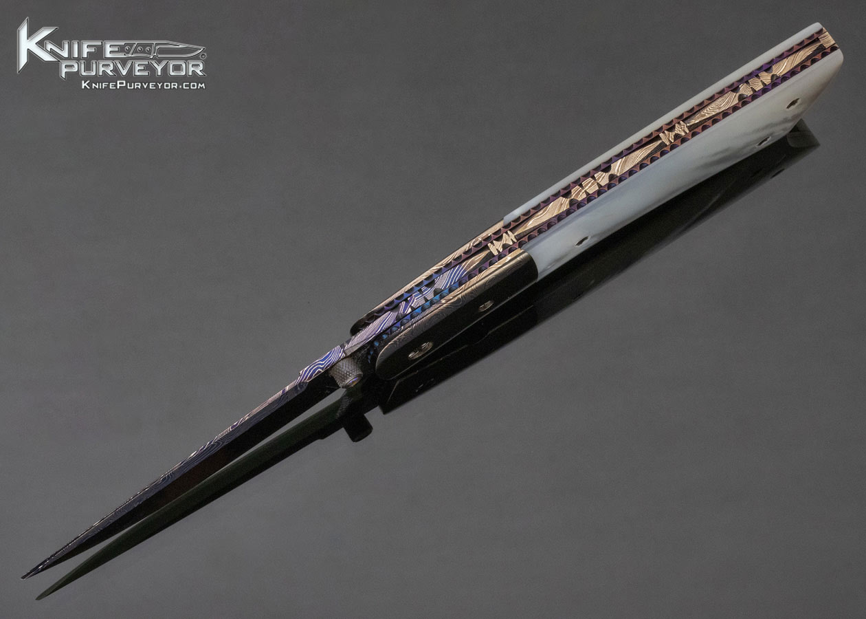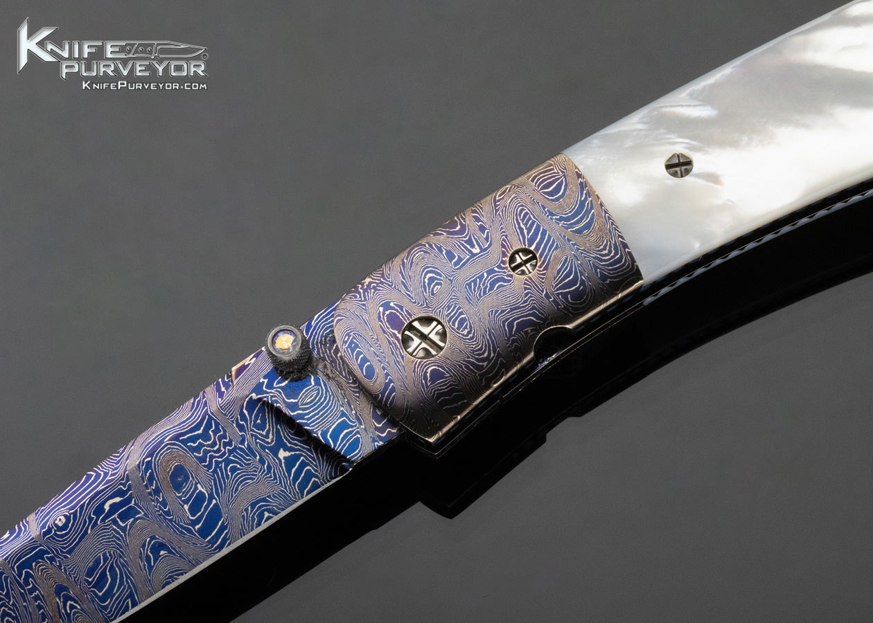 Barry Gallagher Custom Knife Blued Sole Authorship Damascus and Pearl Linerlock