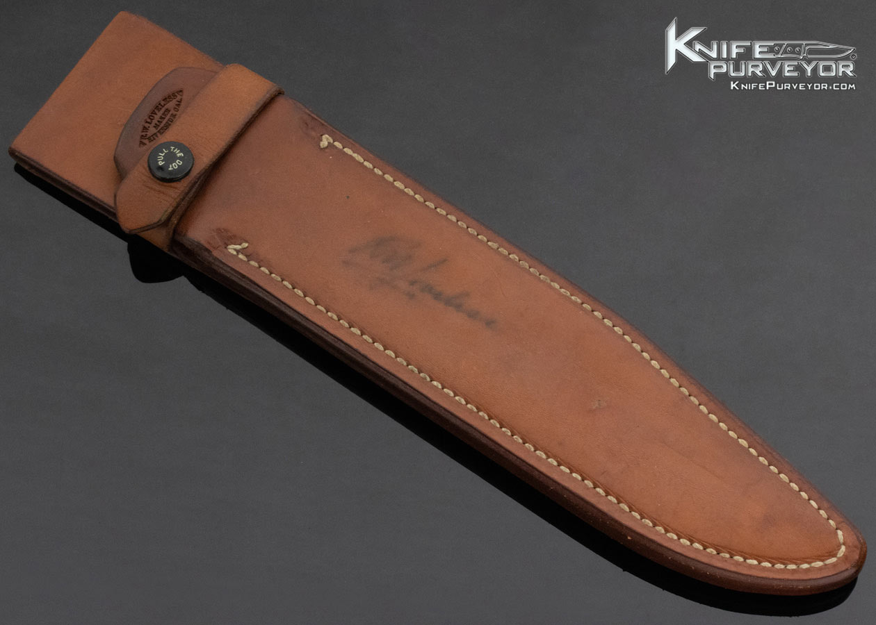 This Big Bear Fighter was made by Bob Loveless. It features an 8 ½" ATS 34 steel blade. It features Double Nude Lady Logos, all stainless steel fittings,