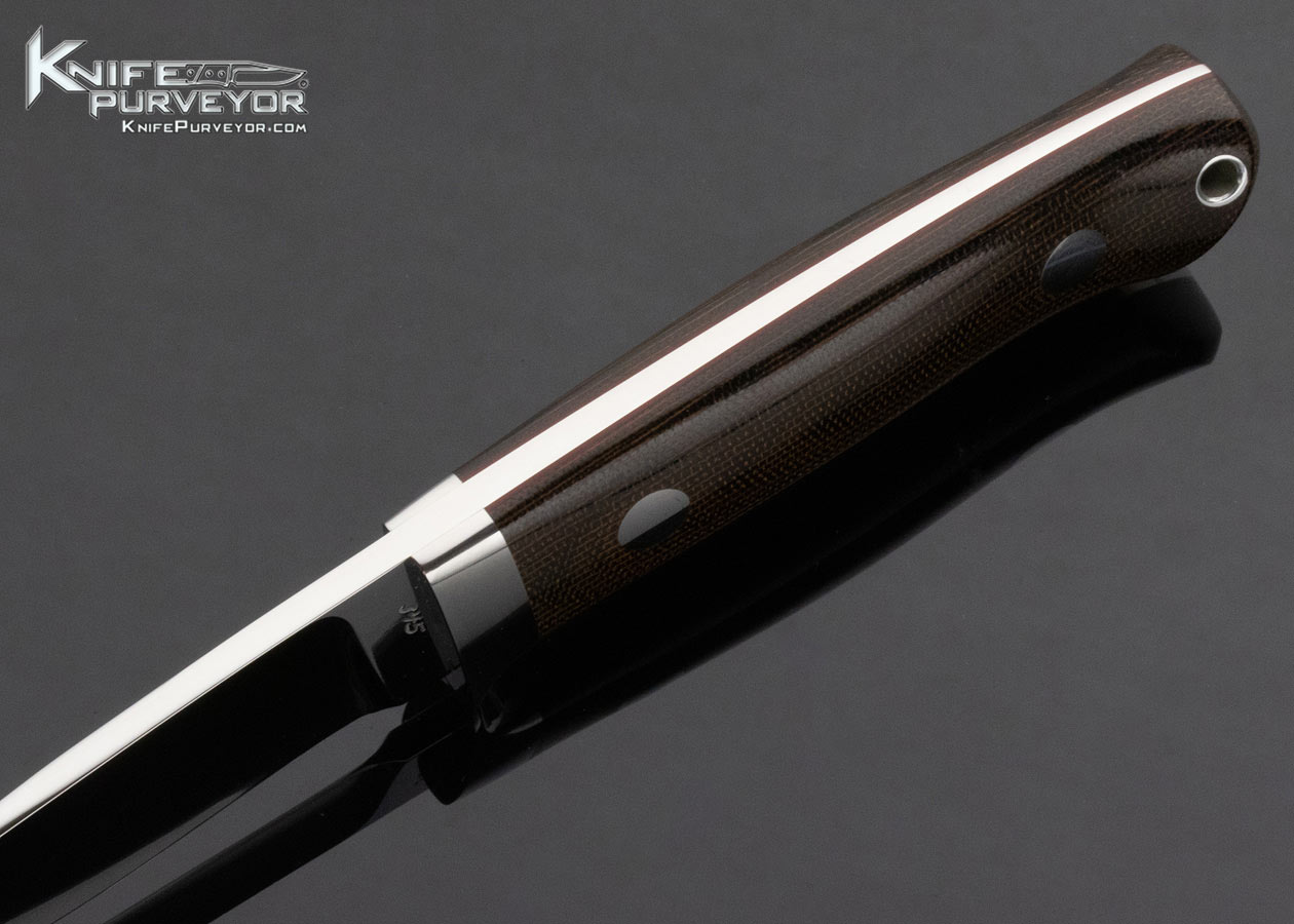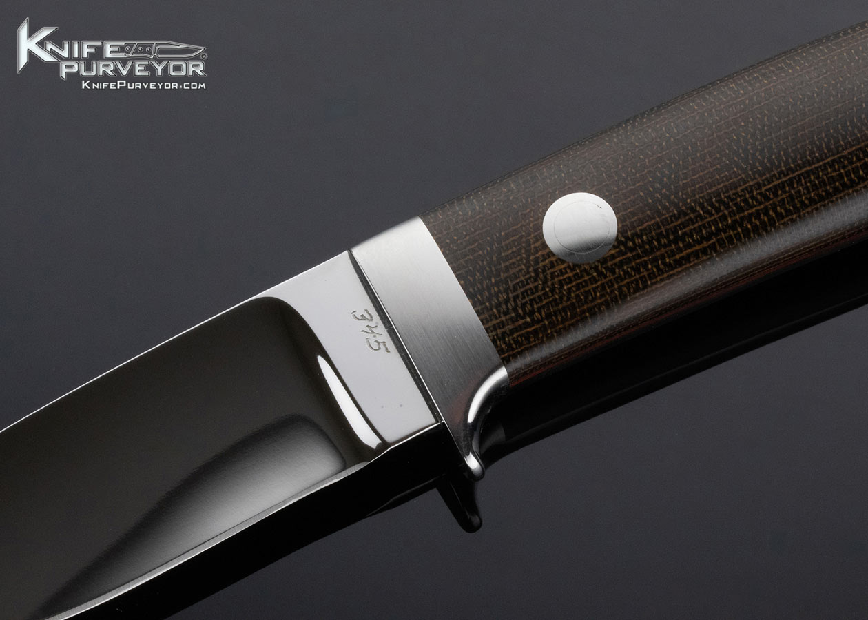 for a few number of Japanese Customers. It has a 3 ¼blade, proportionally shorter handle, Riverside Football Logo on the reverse side of the blade. Featuring Bob Loveless' favorite scale material Green Canvas Micarta with stainless steel fittings. Shop Number 345. Originally belonged to famous US collector Martin Lele.