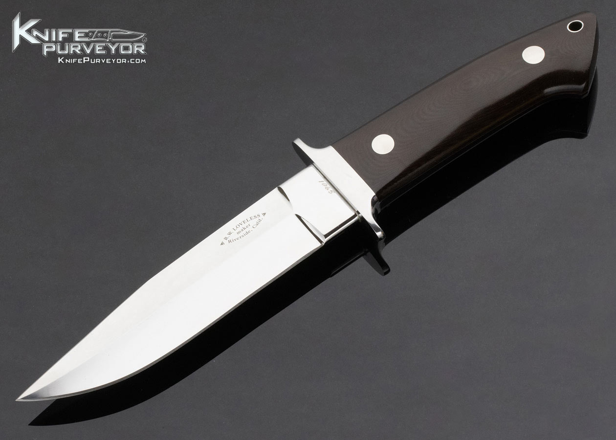 This is a vintage Bob Loveless “Wilderness Knifeâ€. It features a Riverside Football Logo 6†ATS-34 blade, stainless steel fittings, black Micarta handle and is marked with shop Number 1085