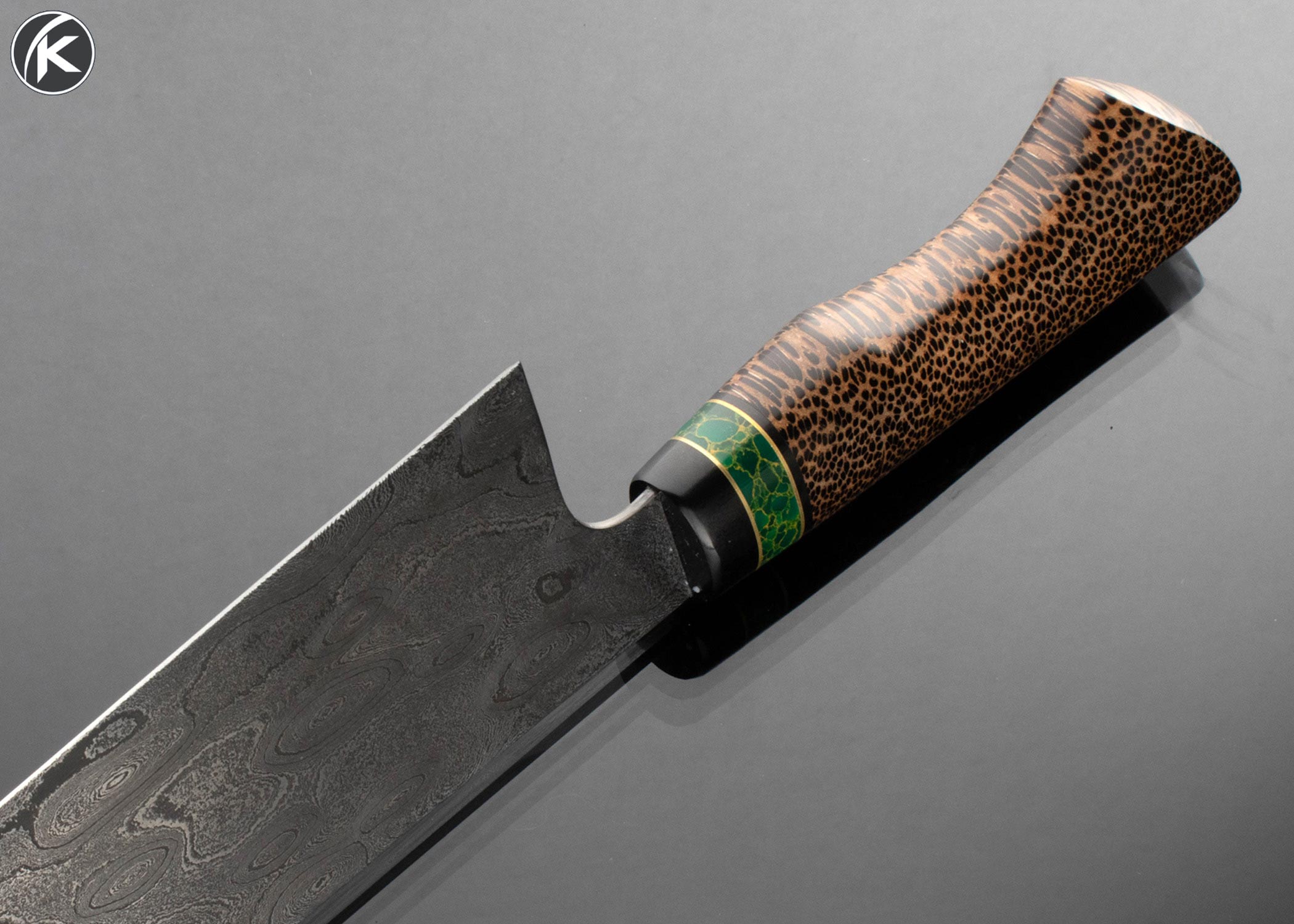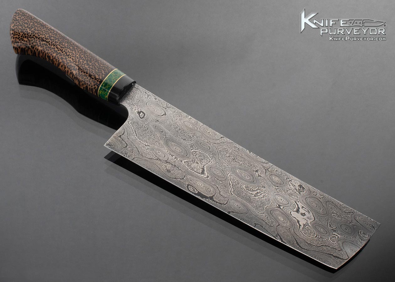 Dan Tompkins Evolution Cutlery Custom Knife Sole Authorship Damascus and Black Palm Wood Pooling Pattern Nakiri Vegetable Cleaver