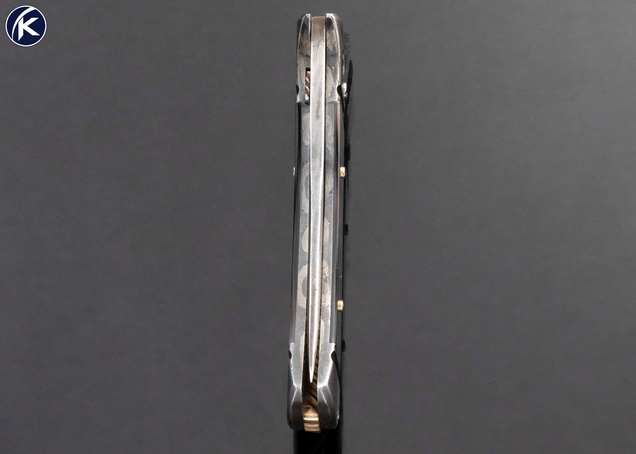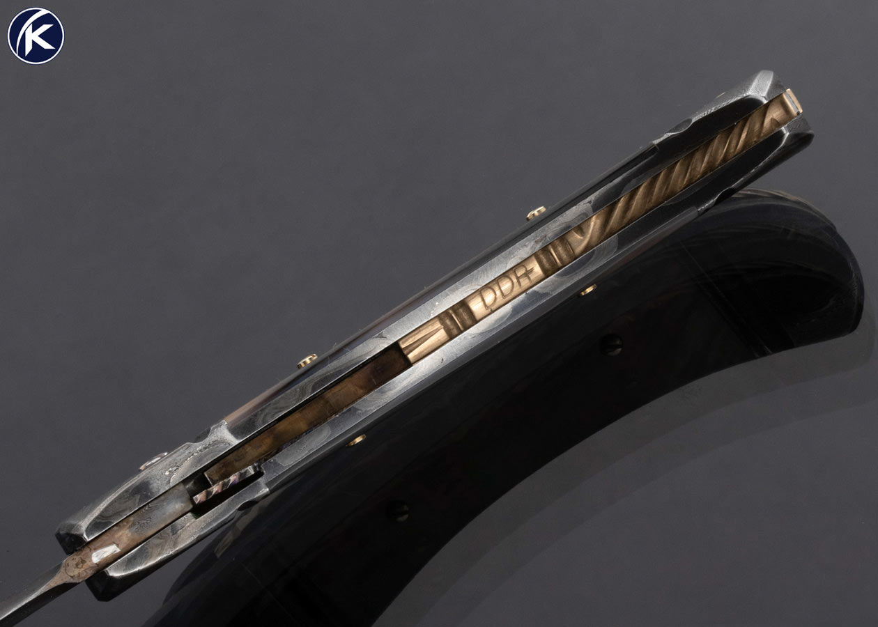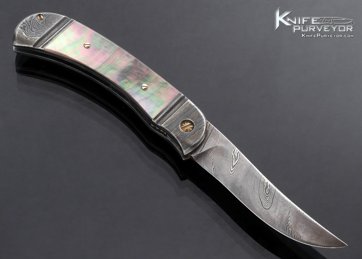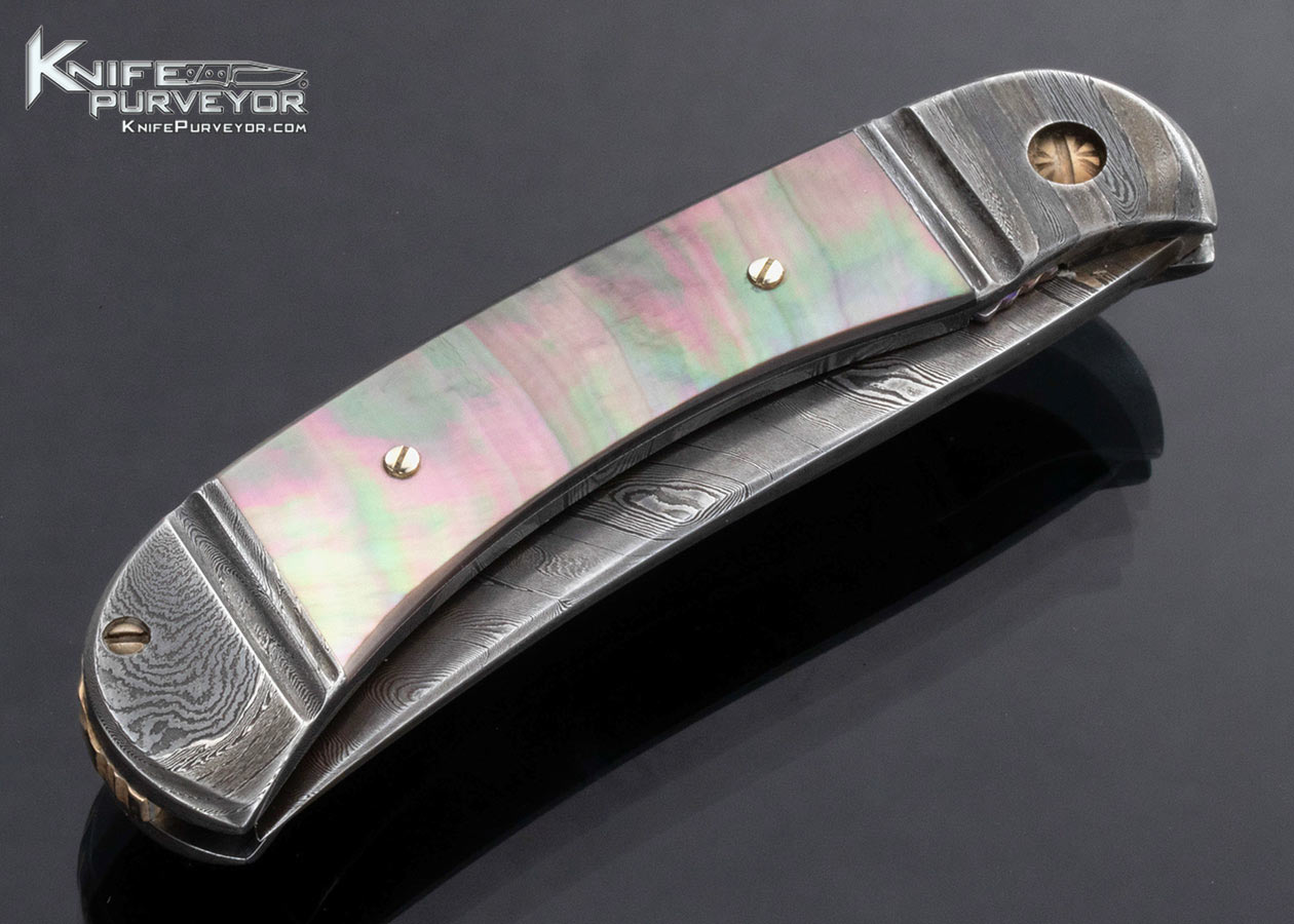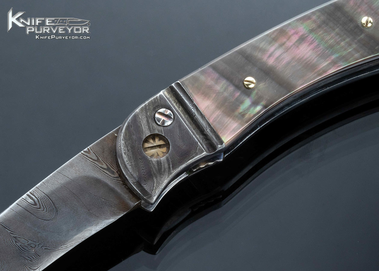 Darrel Ralph Custom Knife Damascus and Black Lip Tahitian Pearl Shell Linerlock Automatic with Gold Spine