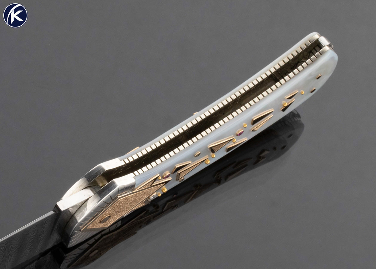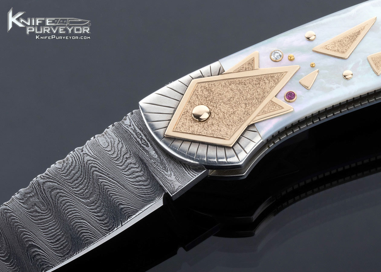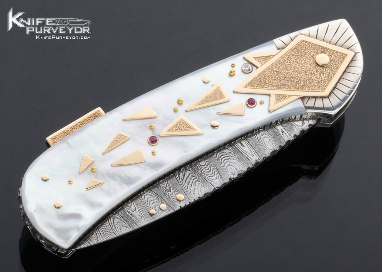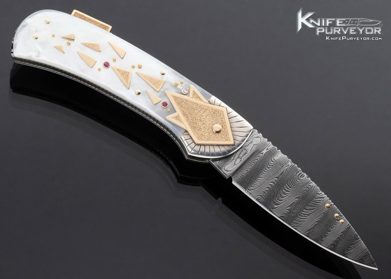 Dellana Custom Knife Sole Authorship Damascus with 14Kt Gold, Diamond and Ruby Encrusted Lockback “Meteor Shower” Featured in “The Art knives of Van Barnett & Dellana”