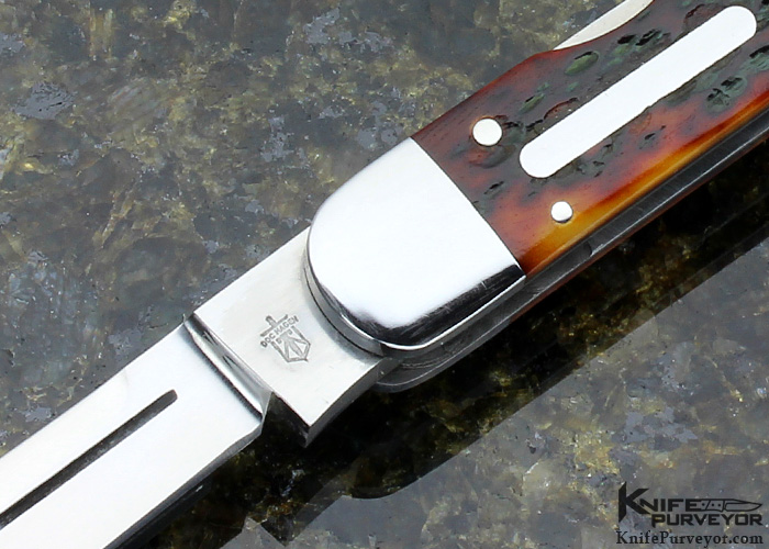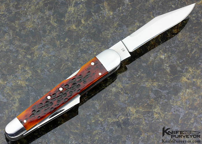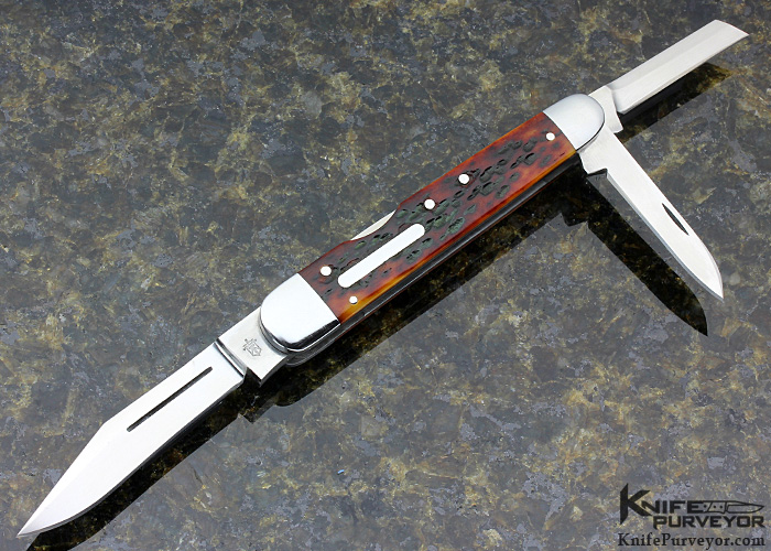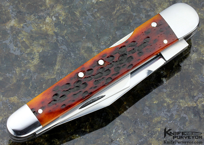 A great Whittler from Doc Hagen. The main lockback blade is ground from very thick stock for this size knife and it inspires confidence in the user. All 3 blades have attractive top swedge grinds on one side. The Jigged Bone Scales are fitted very well and the Escutcheon looks great.
