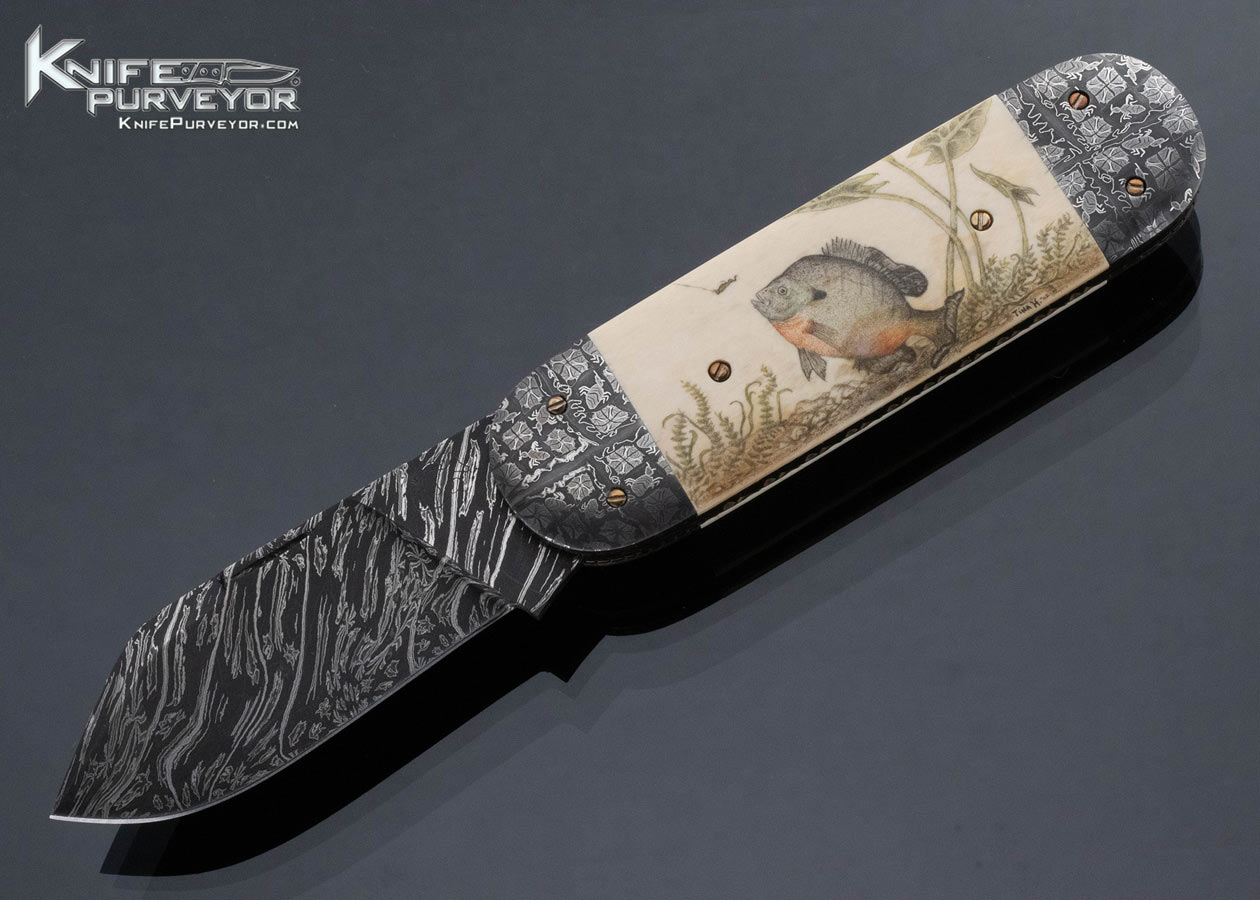 Don Hanson III Custom Knife Sole Authorship Damascus Sunfish Slipjoint Scrimshawed by Tina Hanson