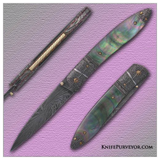 Don Hanson III’s Custom Knife: Sole Authorship Damascus Blade and Bolsters with 18Kt Gold Backbar and Blacklip Pearl Scales