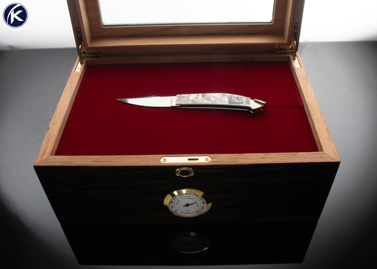 Emmanuel Esposito Custom Knife “The Iliad and The Odyssey” Engraved Jumbo Rhino Tail Lock by Brian Hochstrat with French Fitted Display Case