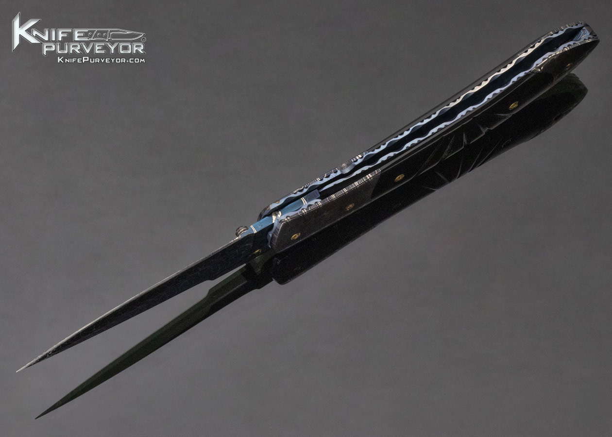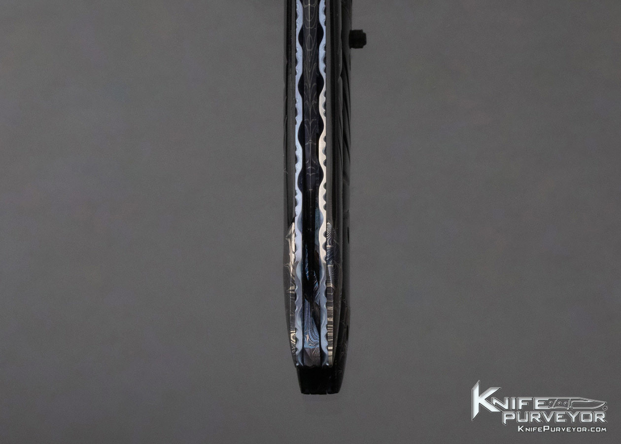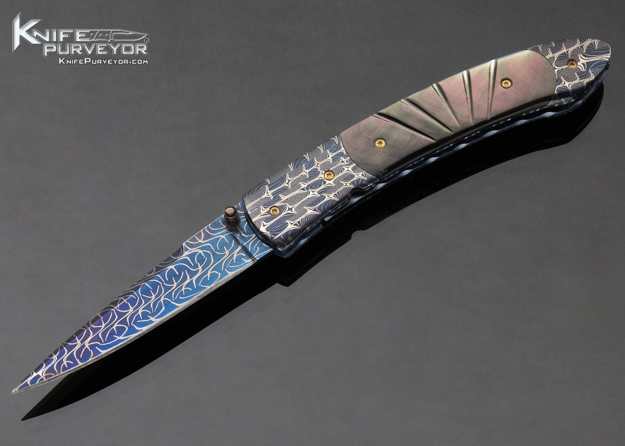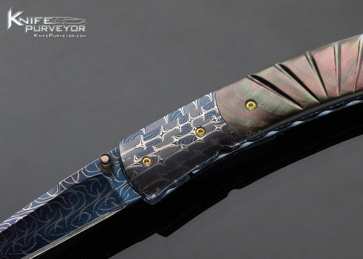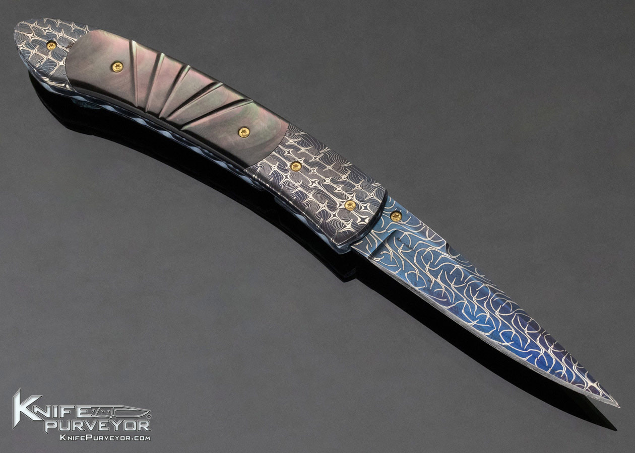 Frank Niro Custom Knife Blued Robert Eggerling Damascus & Fluted Black Lip Pearl Linerlock