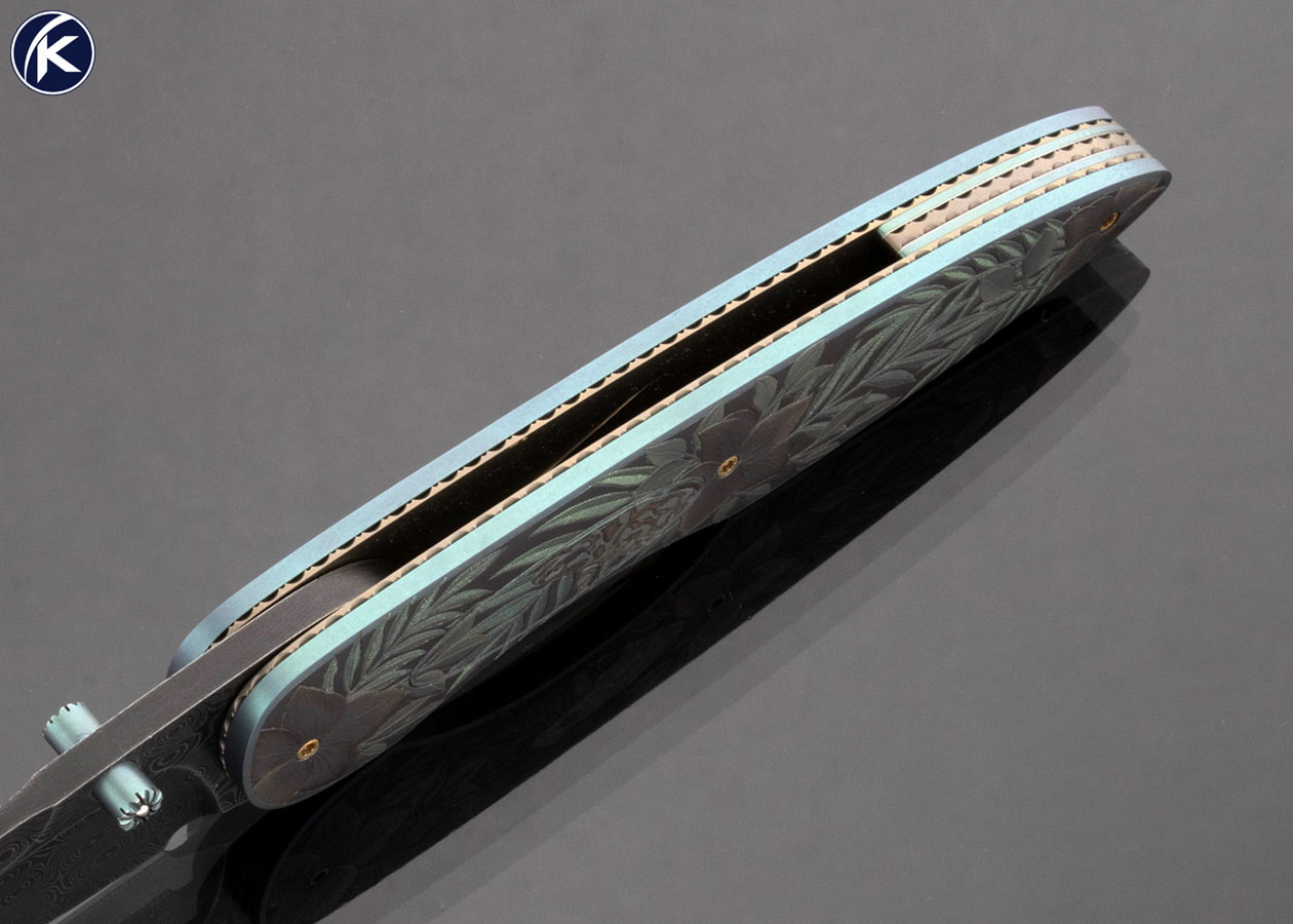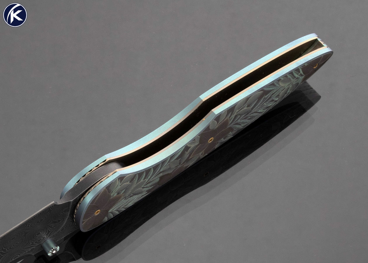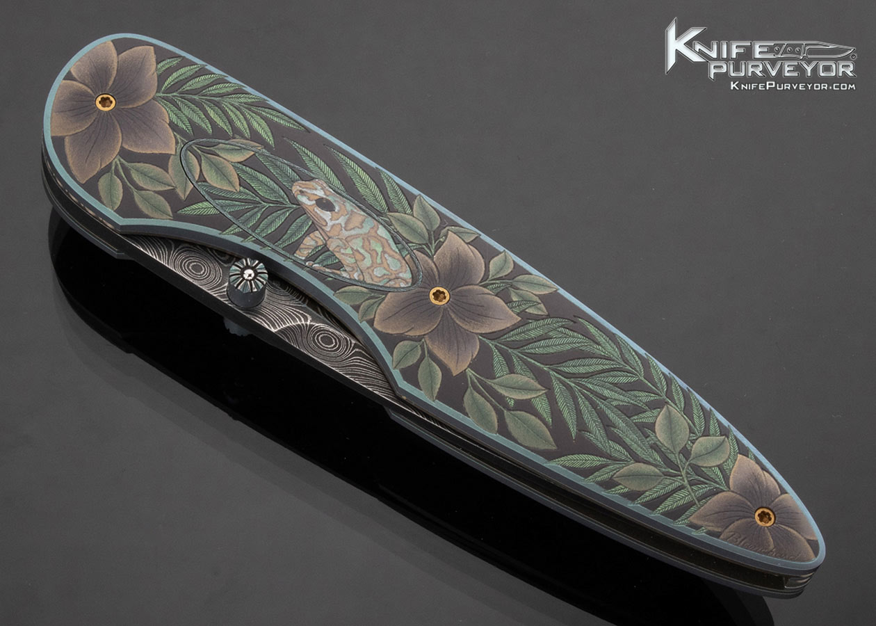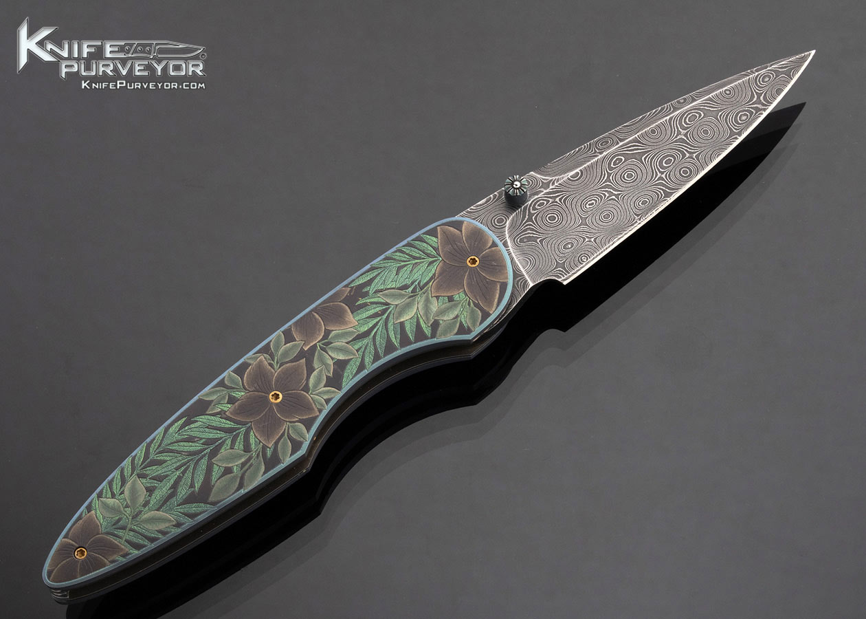 Gary Blanchard Custom Knife Devin Thomas “Raindrop” Damascus & Sole Authorship Engraved Differentially Anodized Titanium Button Lock