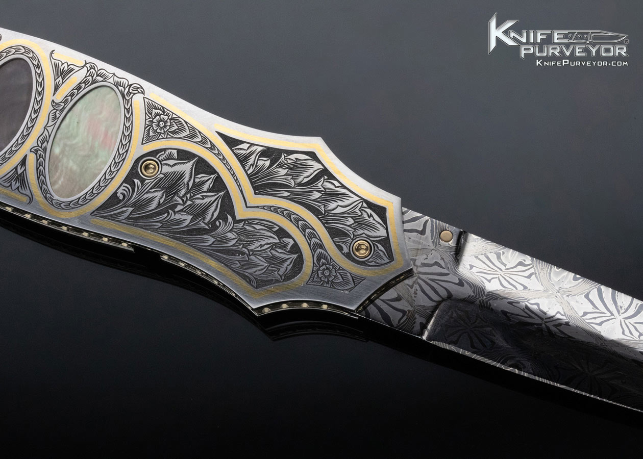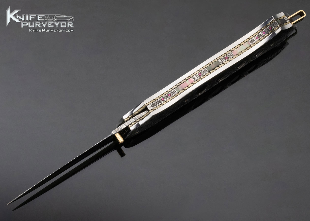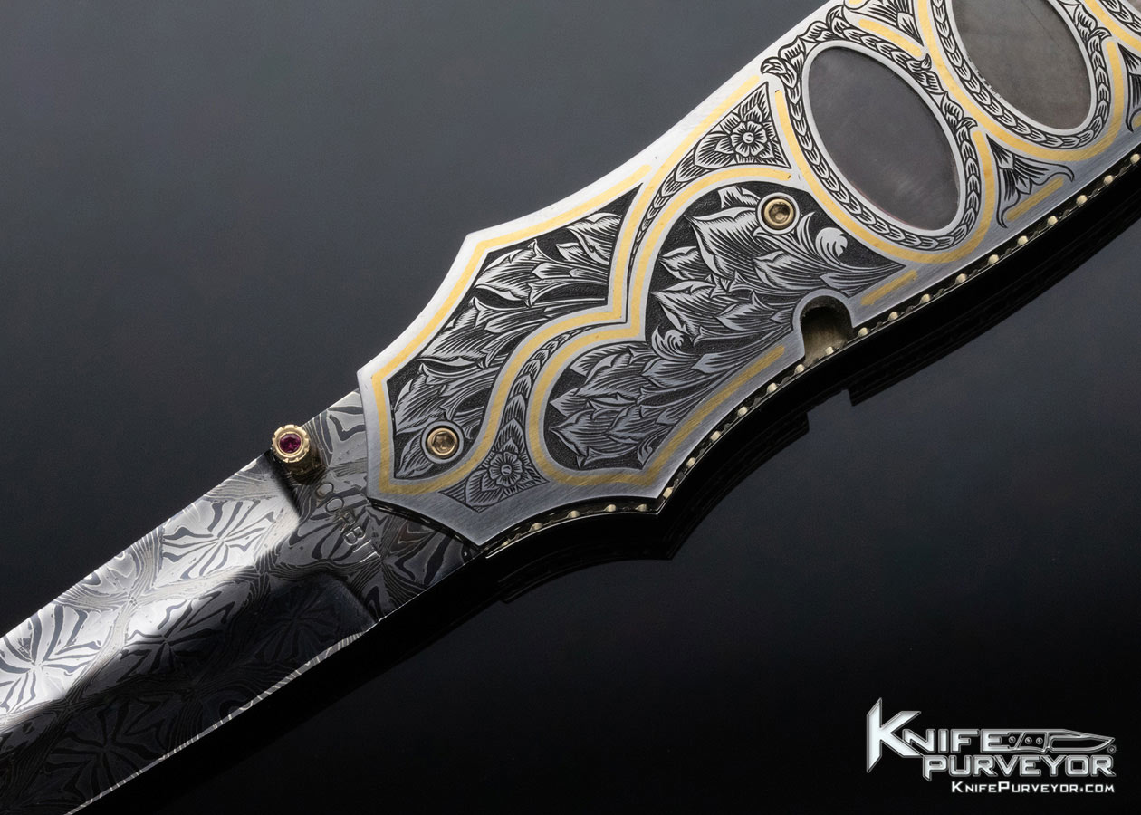 Jerry Corbit Custom Knife Engraved by Bruce Shaw with 18Kt Gold with Rubies and Pearls and Robert Eggerling Damascus and Tahitian Blacklip Pearl Inlays Linerlock