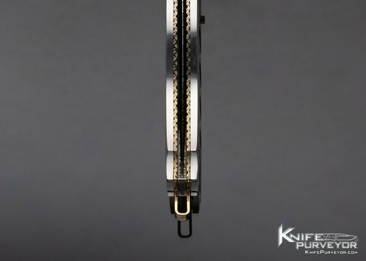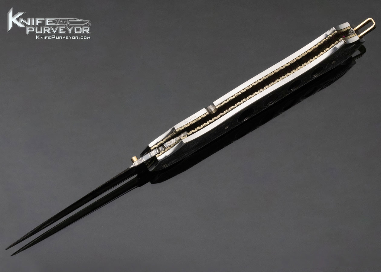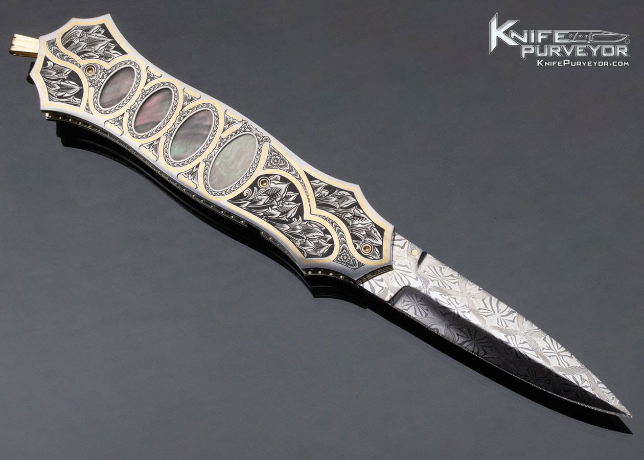 Jerry Corbit Custom Knife Engraved by Bruce Shaw with 18Kt Gold with Rubies and Pearls and Robert Eggerling Damascus and Tahitian Blacklip Pearl Inlays Linerlock
