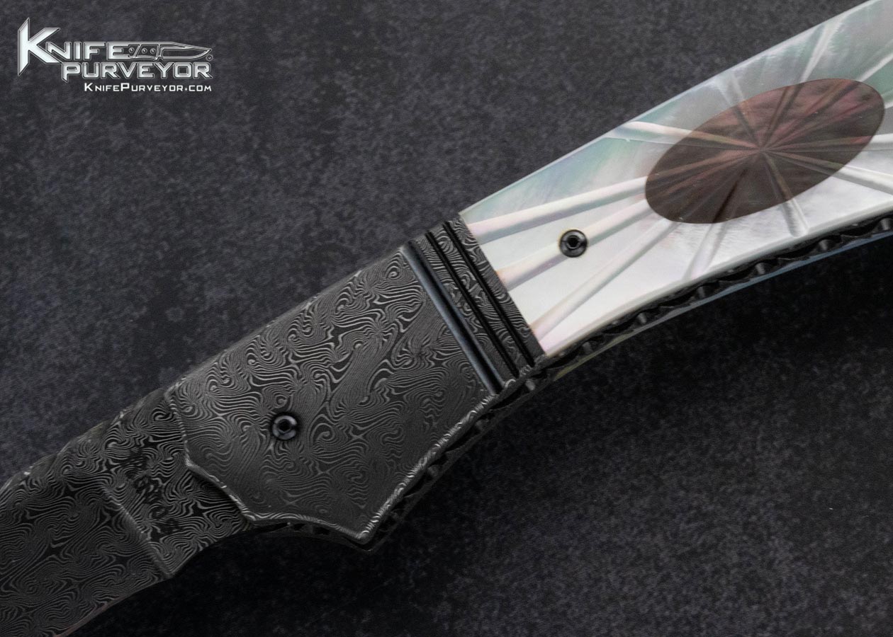 Jerry Rados Custom Knife Sole Authorship Turkish Twist Damascus Fluted Mother of Pearl and Black Lip Tahitian Pearl Shell Scale Release Automatic