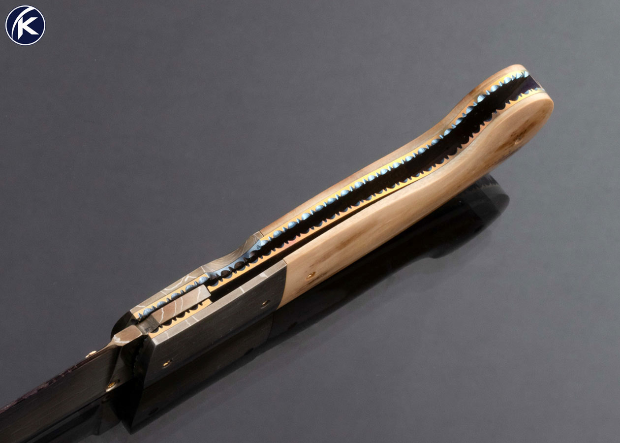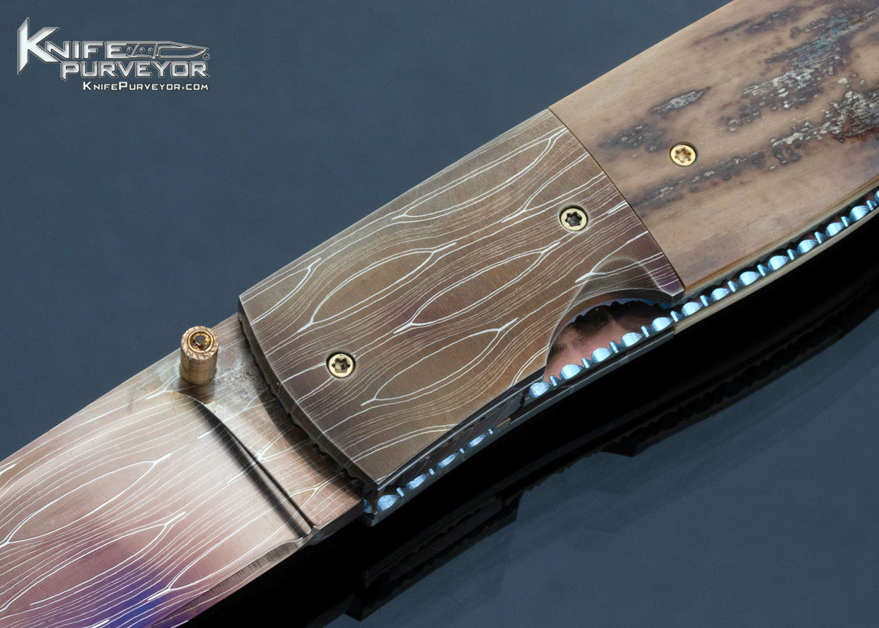 Jim Downs Custom Knife Mammoth and Blued Damascus Linerlock