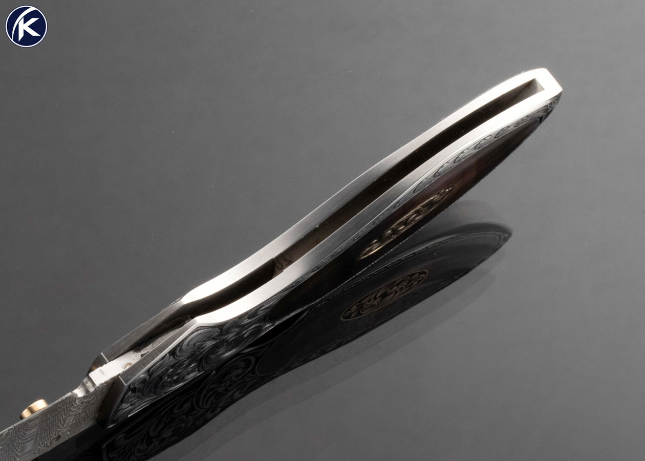 Jim Martin Custom Knife Damascus Black Lip Tahitian Pearl Shell Front Lock with Thumb Stud