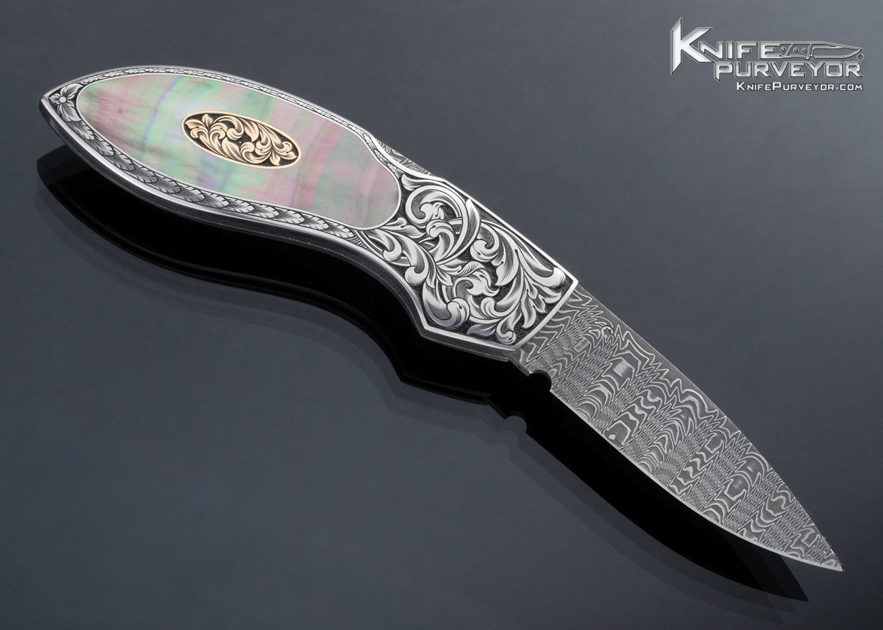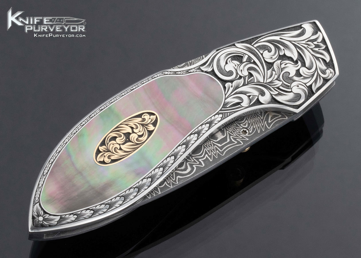 Jim Martin Custom Knife Damascus Black Lip Tahitian Pearl Shell Front Lock with Thumb Stud