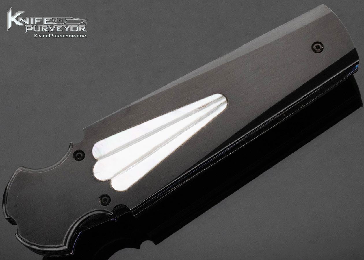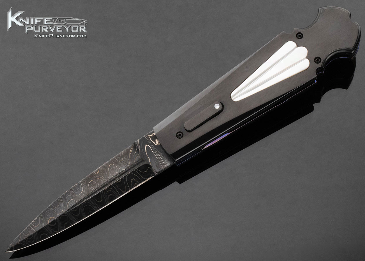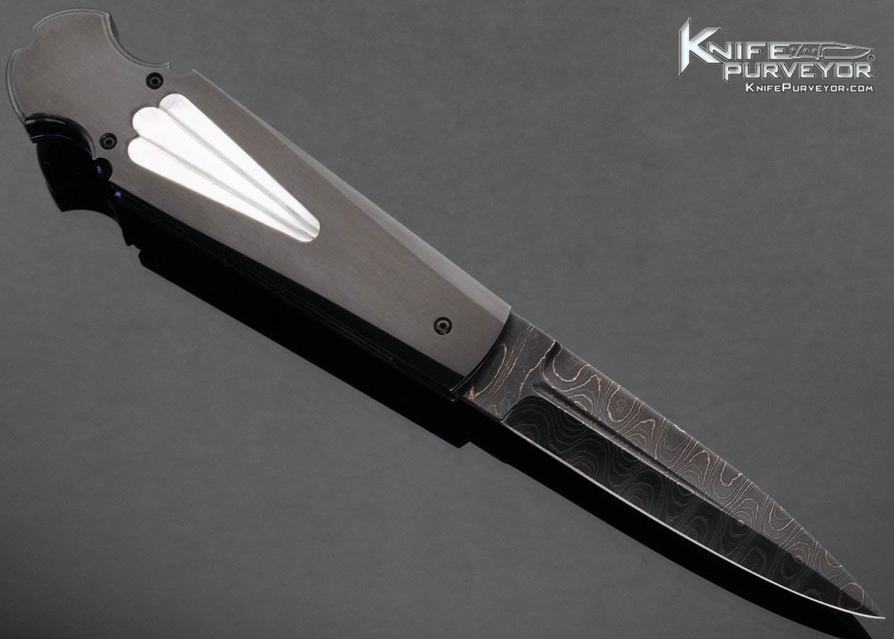 Jim Minnick Custom Knife Black Oxide Damascus and O-1 Tool Steel Pearl Interframe Leaf Spring Automatic Linerlock Dagger