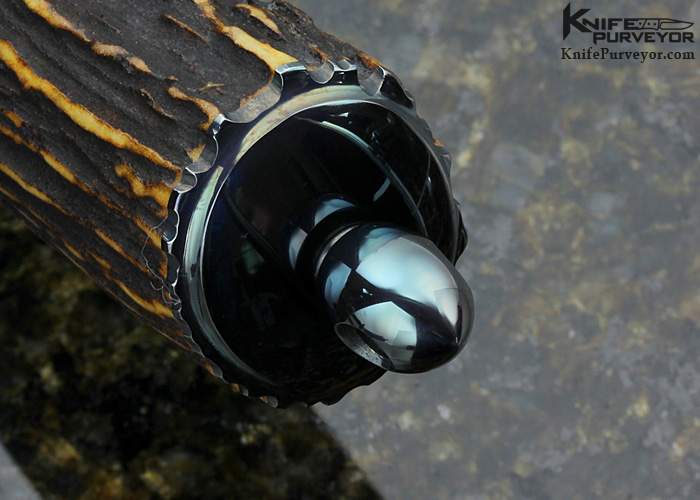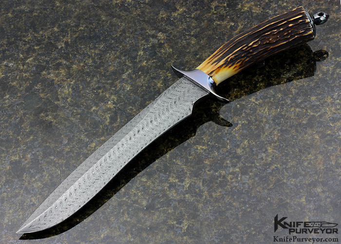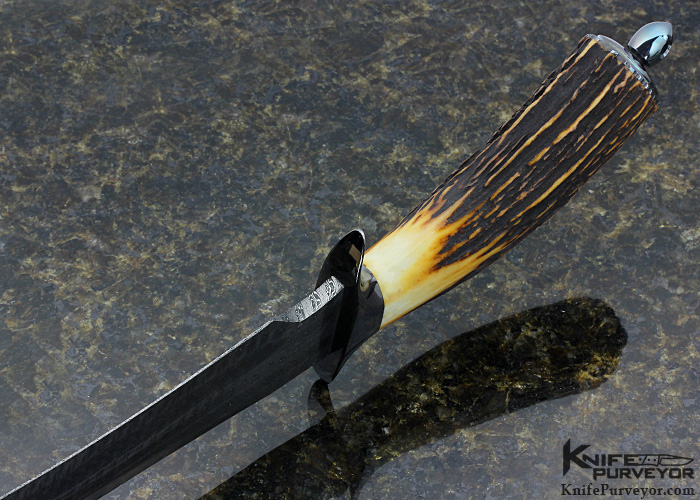 Jim Siska Custom Knife Jerry Rados Turkish Twist Damascus Amber Stag Fighter with Blued Steel Guard