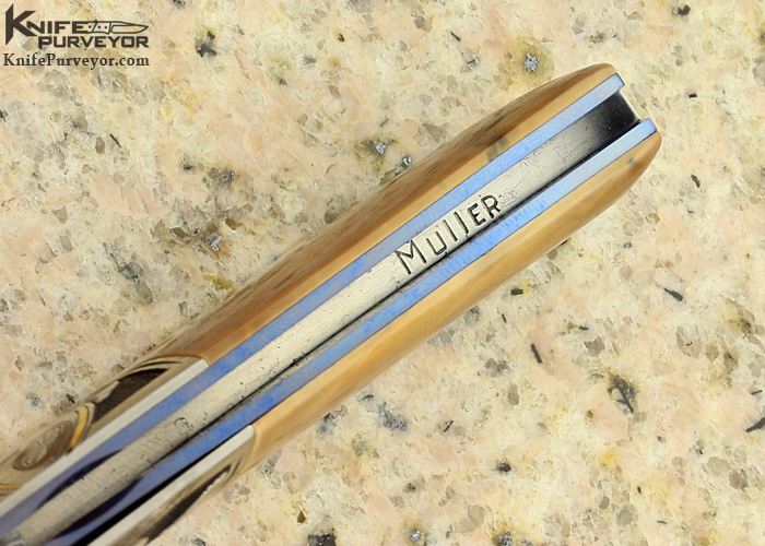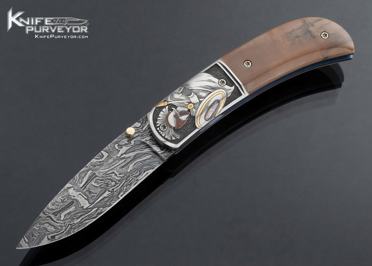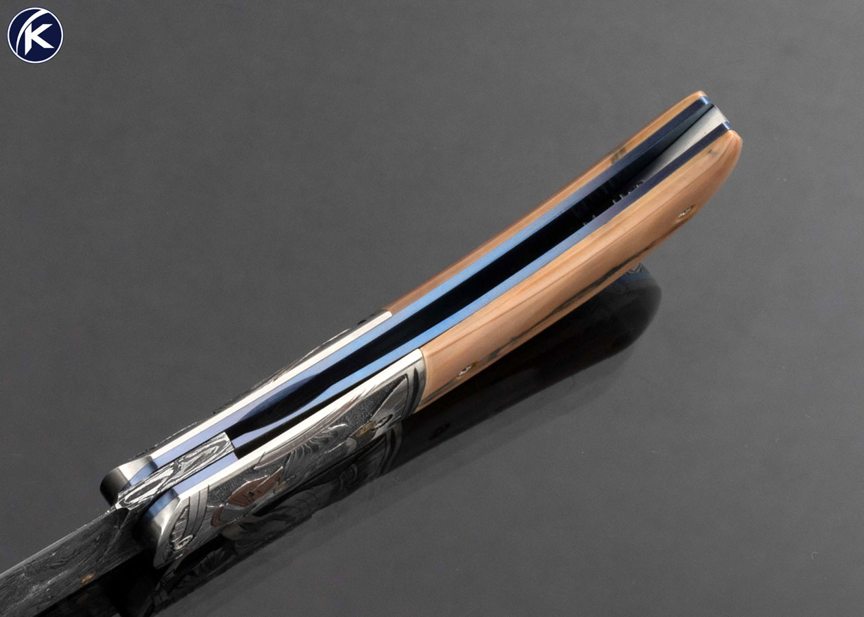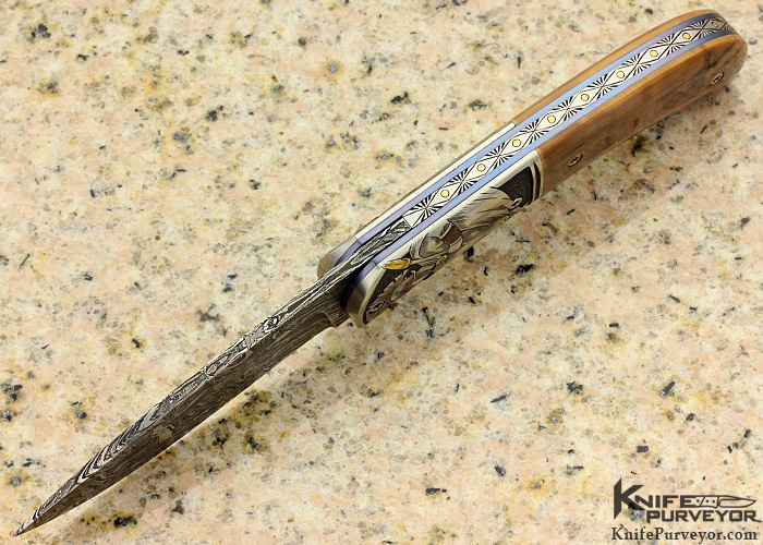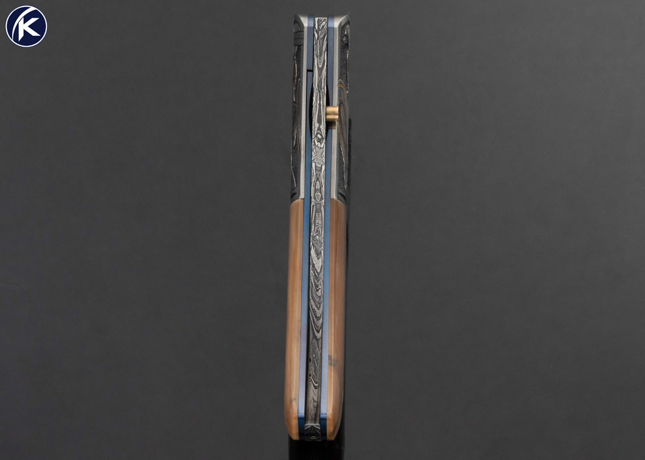 The richly colored Fossilized Walrus is over blue anodized liners. The Bolsters are beautifully engraved 416 stainless with copper and 24kt Gold accents. The Damascus is Jody's as well. There is some really nice filework with Gold inlay along the Spine. This is a nicely sized pocket knife and a conversation starter for sure.