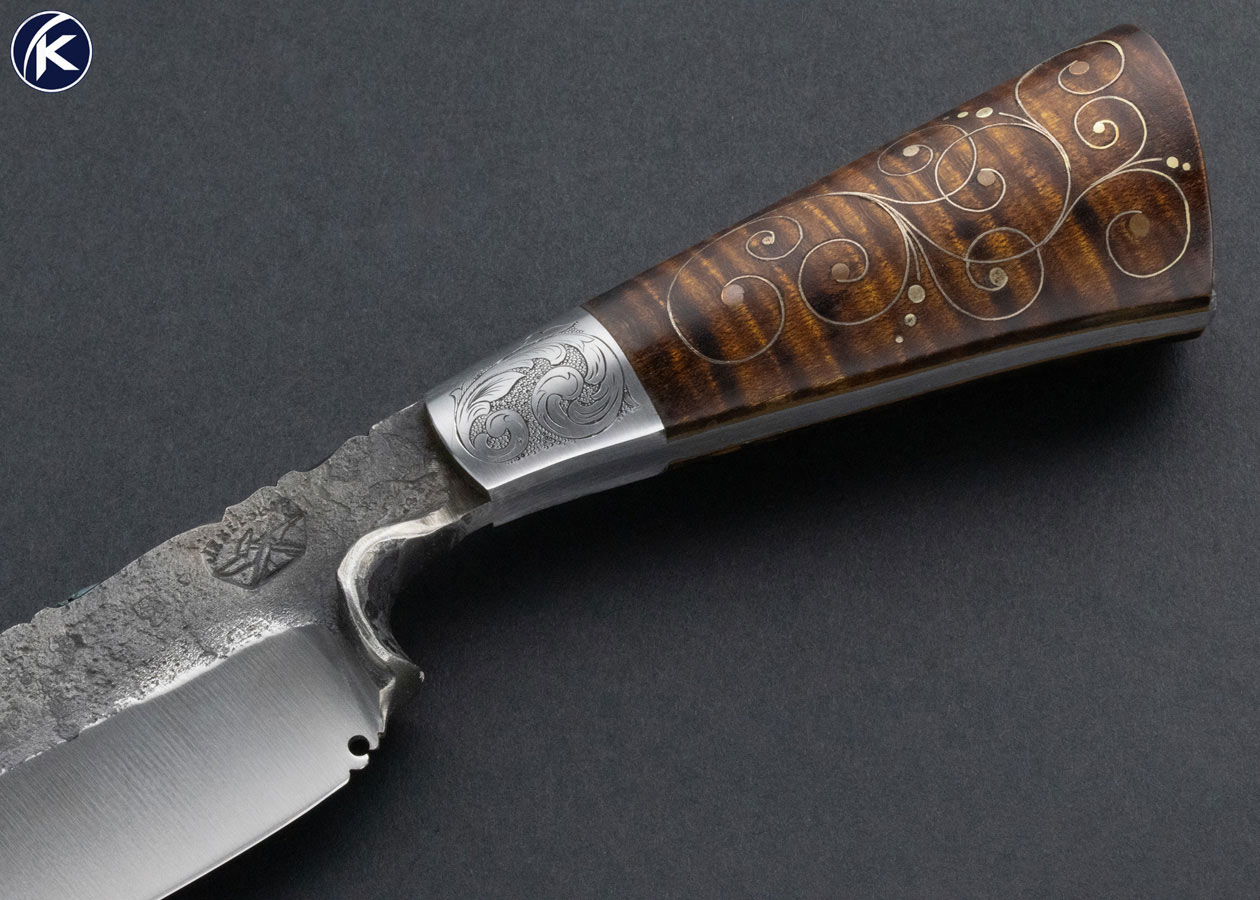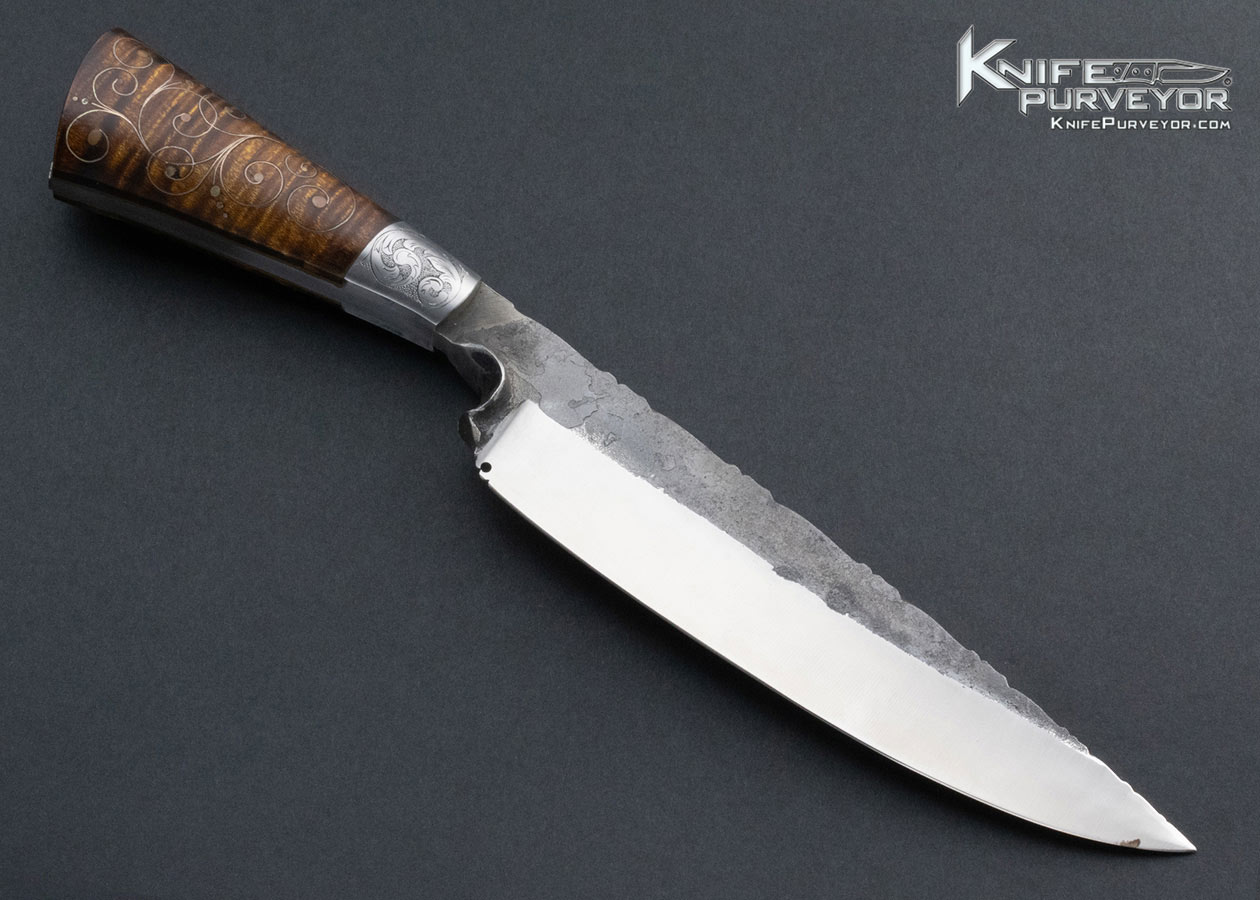 Joe Keeslar M.S. Custom Knife Engraved Hand Forged Fixed Blade with Silver Wire Inlaid Tiger Striped Maple Complete with Sheath