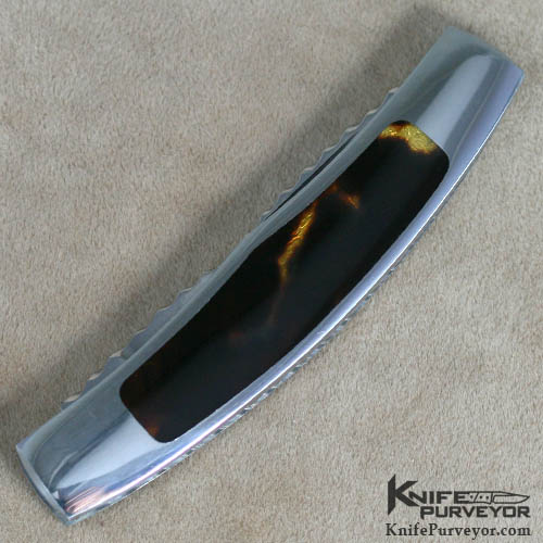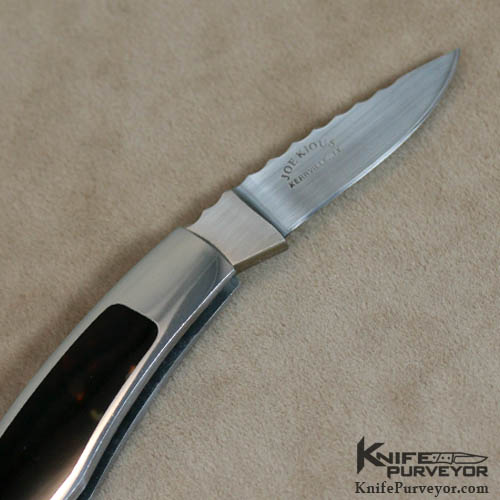 This two bladed slipjoint was made by Joe Kious. The inlays are antique tortoise shell with 24Kt Gold leaf behind it to accent the beauty of the shell. The wharncliff blade measures 1 5/8" and the drop point blade measures 1 5/8".