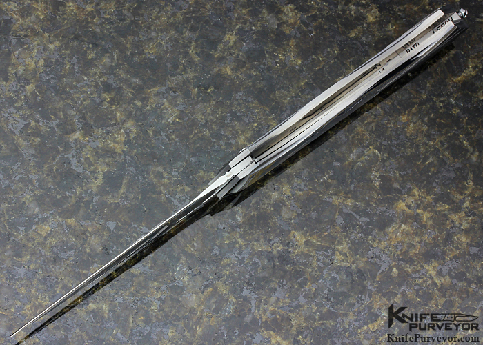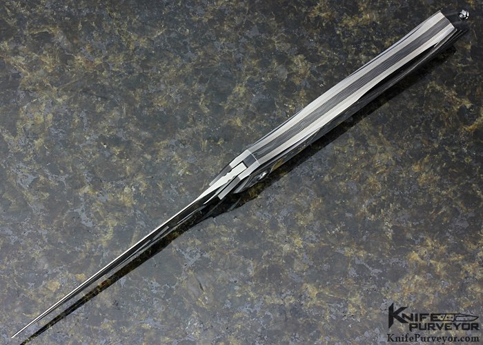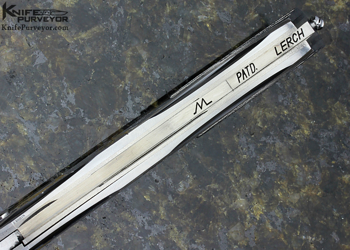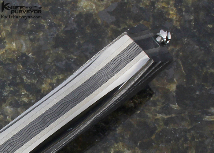 The craftsmanship is impeccable on this sleek design from Matthew Lerch. The Damascus inlays on both the blade and handle are striking. This knife is what is known as a Credit Card Automatic. The release is the carved ball on the butt of the knife.