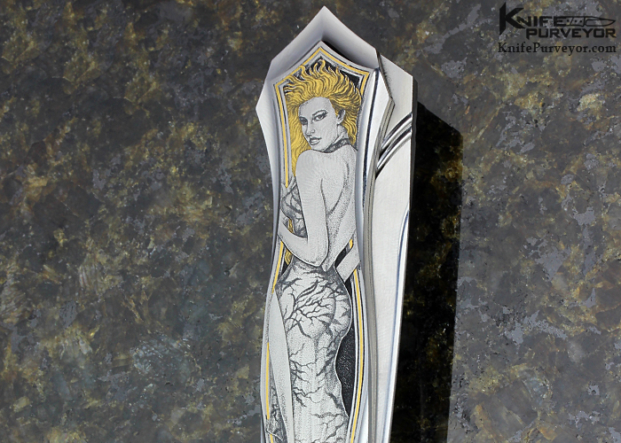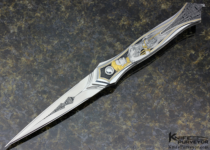The Engraving is amazing in that the artist has given the subject facial expressions that are open to interpretation. The 24kt Gold Inlays along the borders, hair and rope are perfectly done. The liners are textured and the Backspacer is solid damascus.