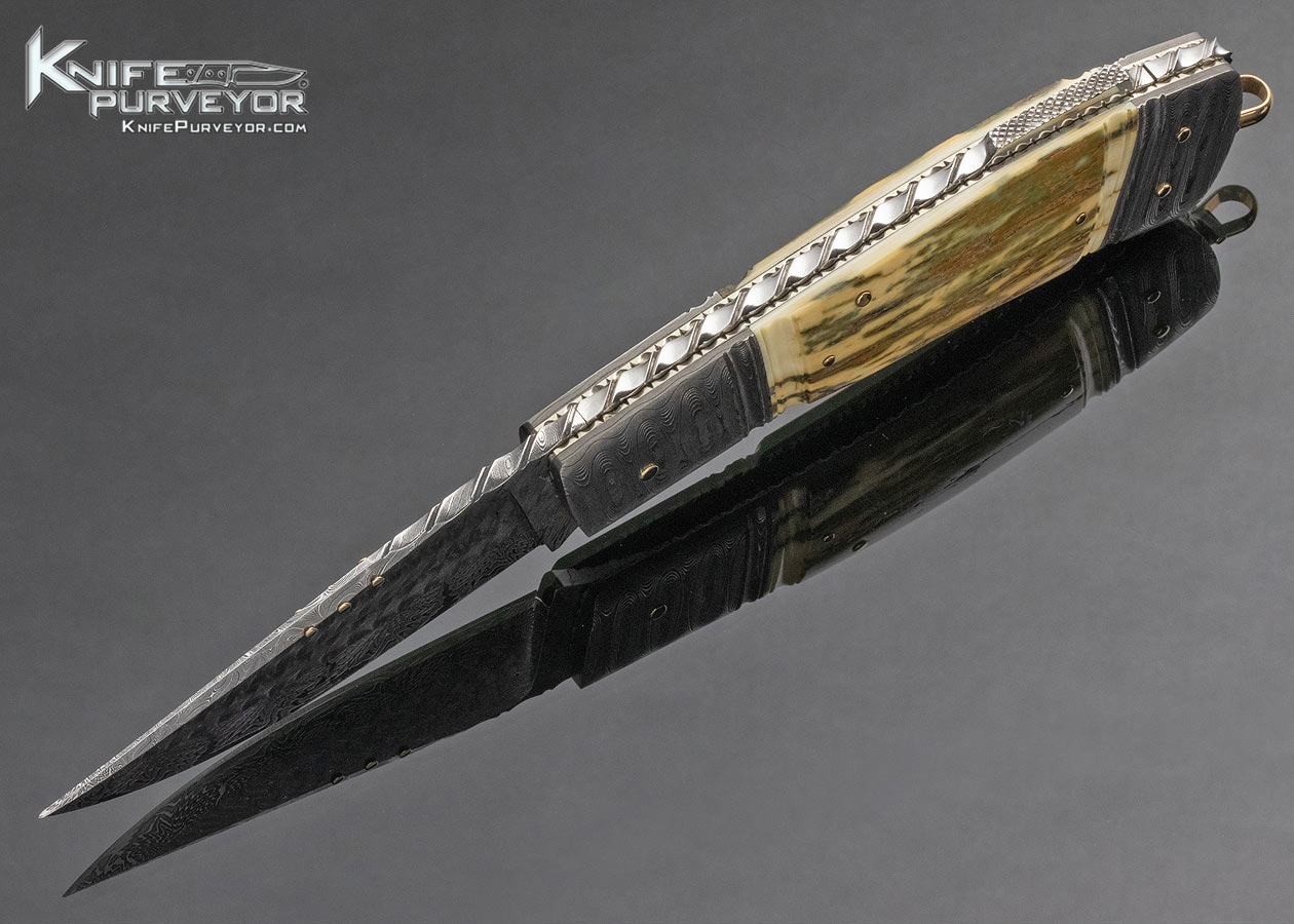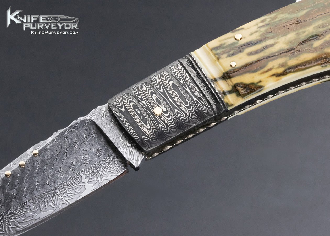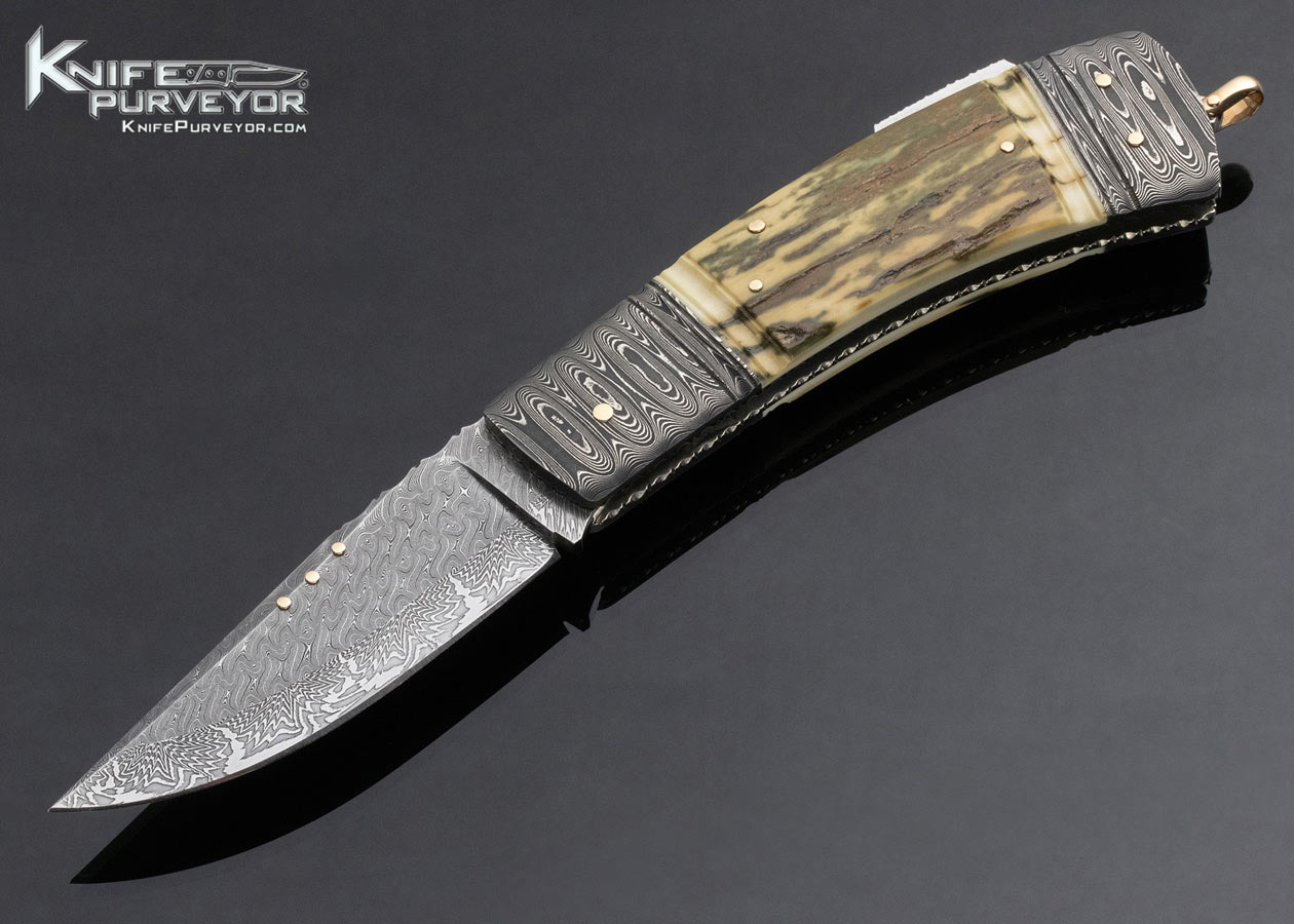 Kay Embretsen Custom Knife Sole Authorship Damascus and Bark Mammoth w Gold Pins and Bale Lockback
