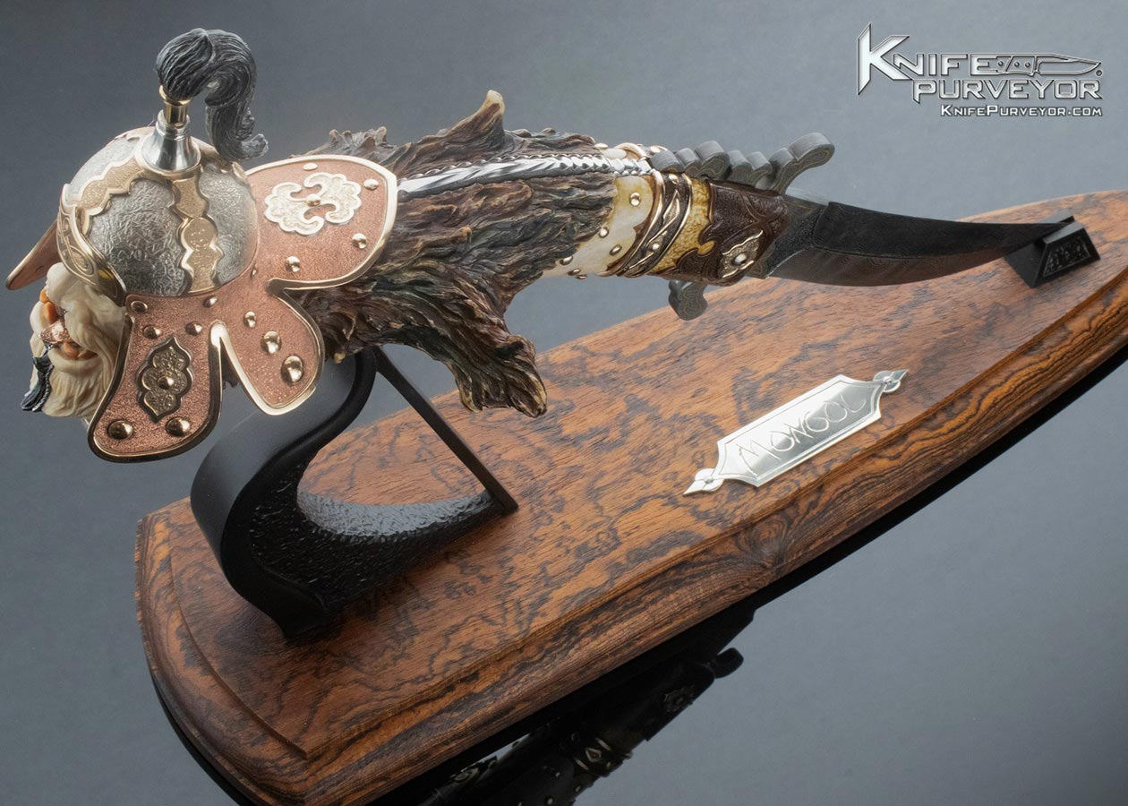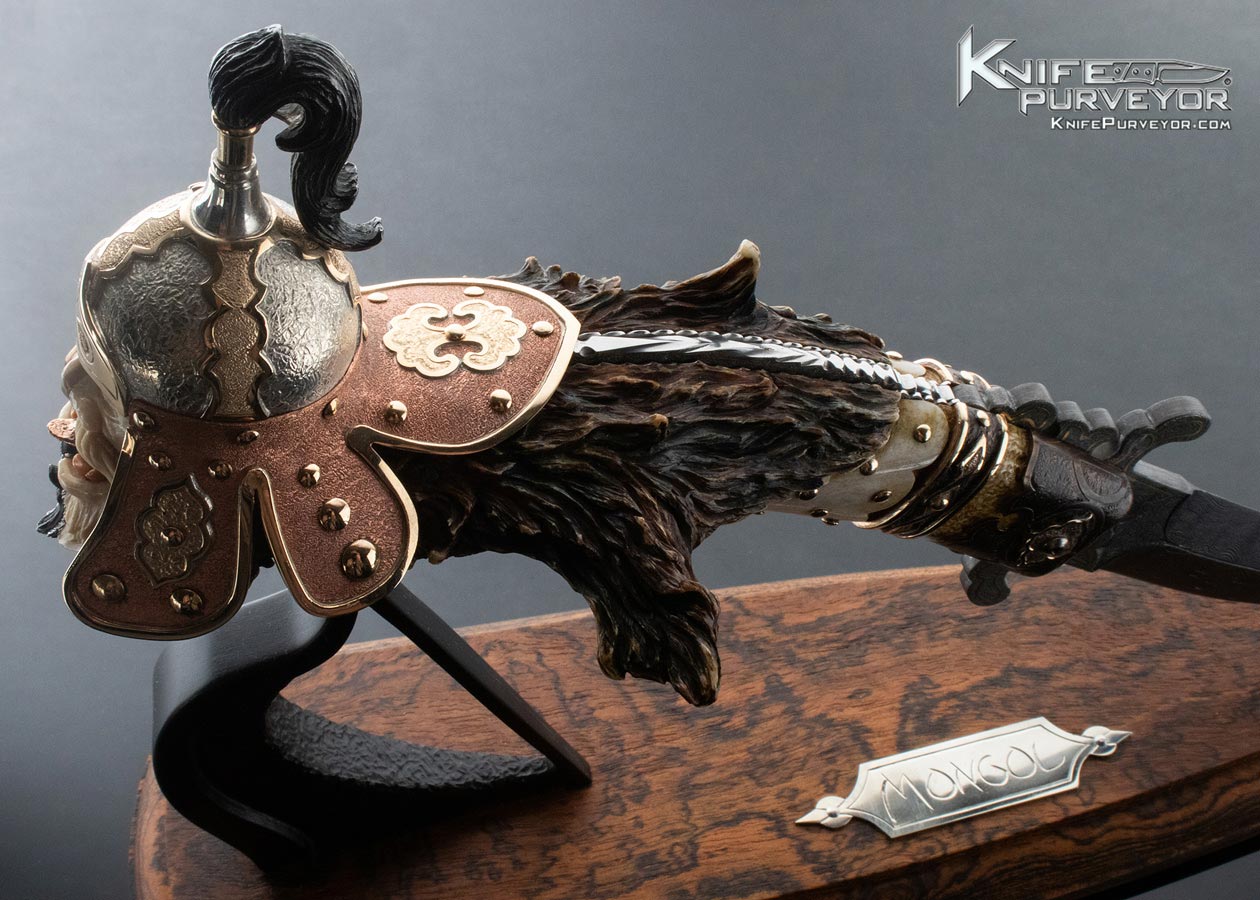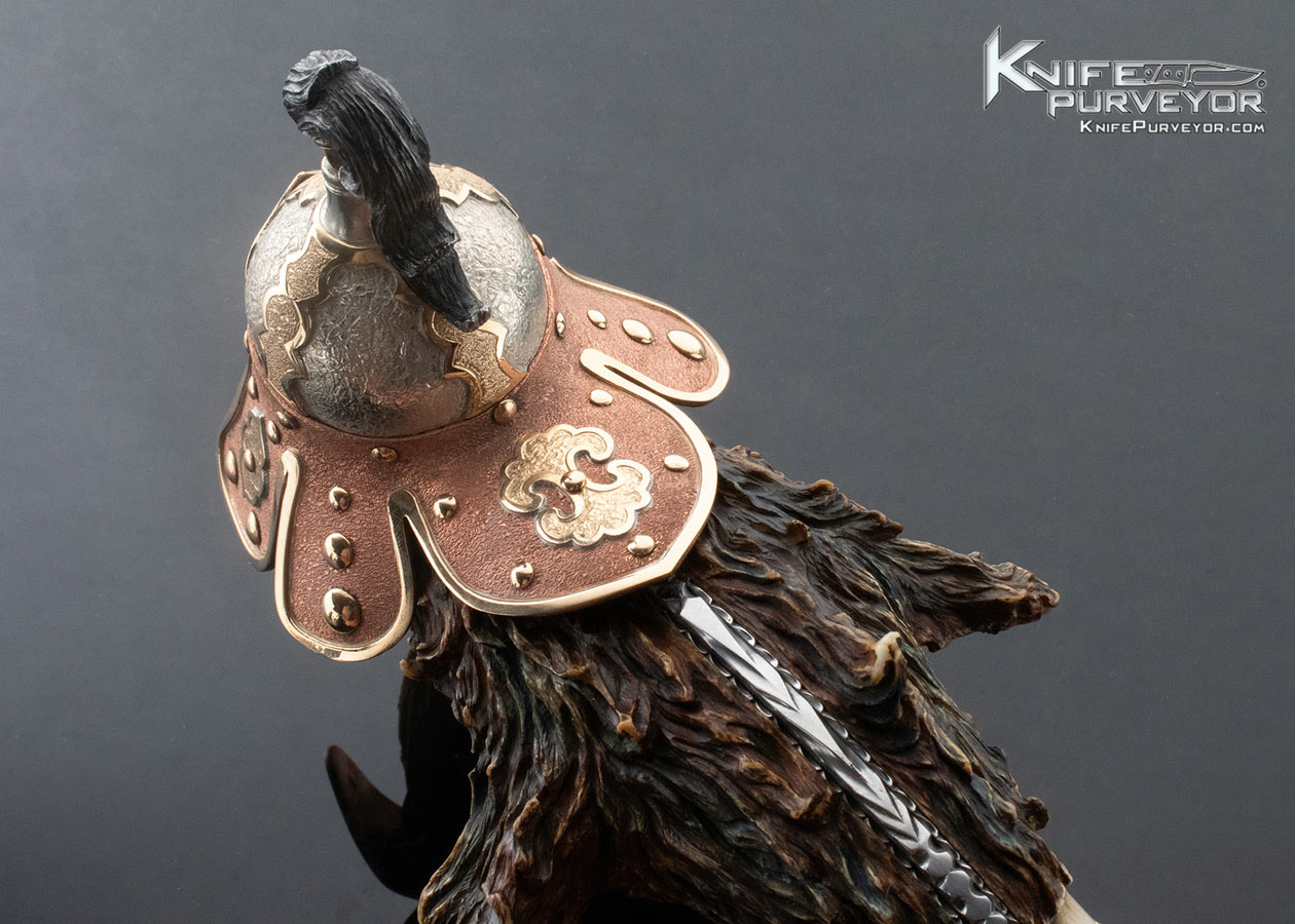 This unique friction folder was inspired by the Mongol warriors from the 13th century. These fierce warriors, with their horses and bows, were an unstoppable force that controlled lands from the Pacific Ocean on the east to the Mediterranean Sea on the west. Many elements of the Mongol warrior have been incorporated into this folder. The helmet is made from hand-formed Sterling Silver and is trimmed with 14Kt Gold. The original neck guards were often made from leather, with metal studs and plates. Larry Fuegen chose to use copper with 14Kt Gold to create the unique neck guard for this helmet. The helmet is topped with a carved blued steel horse hair tassel. The stag handle is carved to represent a heavy fur cape, and the face is carved Mammoth with Fossil Walrus teeth, 14Kt Rose Gold tongue and Hematite eyes. Sterling Silver and 14Kt Gold were used for the throat guard and arm gurads. Hand formed copper bolsters and belts have a brown patina with the 14Kt Gold trim. A fileworked steel spacer and Satinless Steel liners complete the handle. The 5 1/2 inch forged random pattern Damascus blade is a style used by the Mongols and has over 24 inches of inilaid 24Kt Gold wire. The display base is Bocote wood and carved African Blackwood representing a stylized Mongol Bow. Overall Length is 13 1/4". Larry hand crafter over 130 individual pieces to complete this folder, not counting patterns, forms and jigs to make this piece. All work done by maker, Larry Fuegen, ABS Mastersmith.