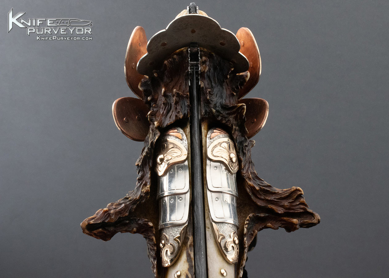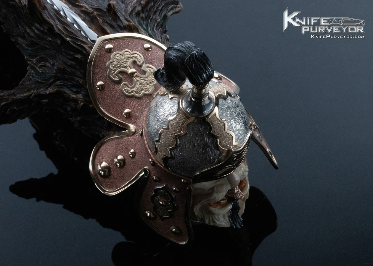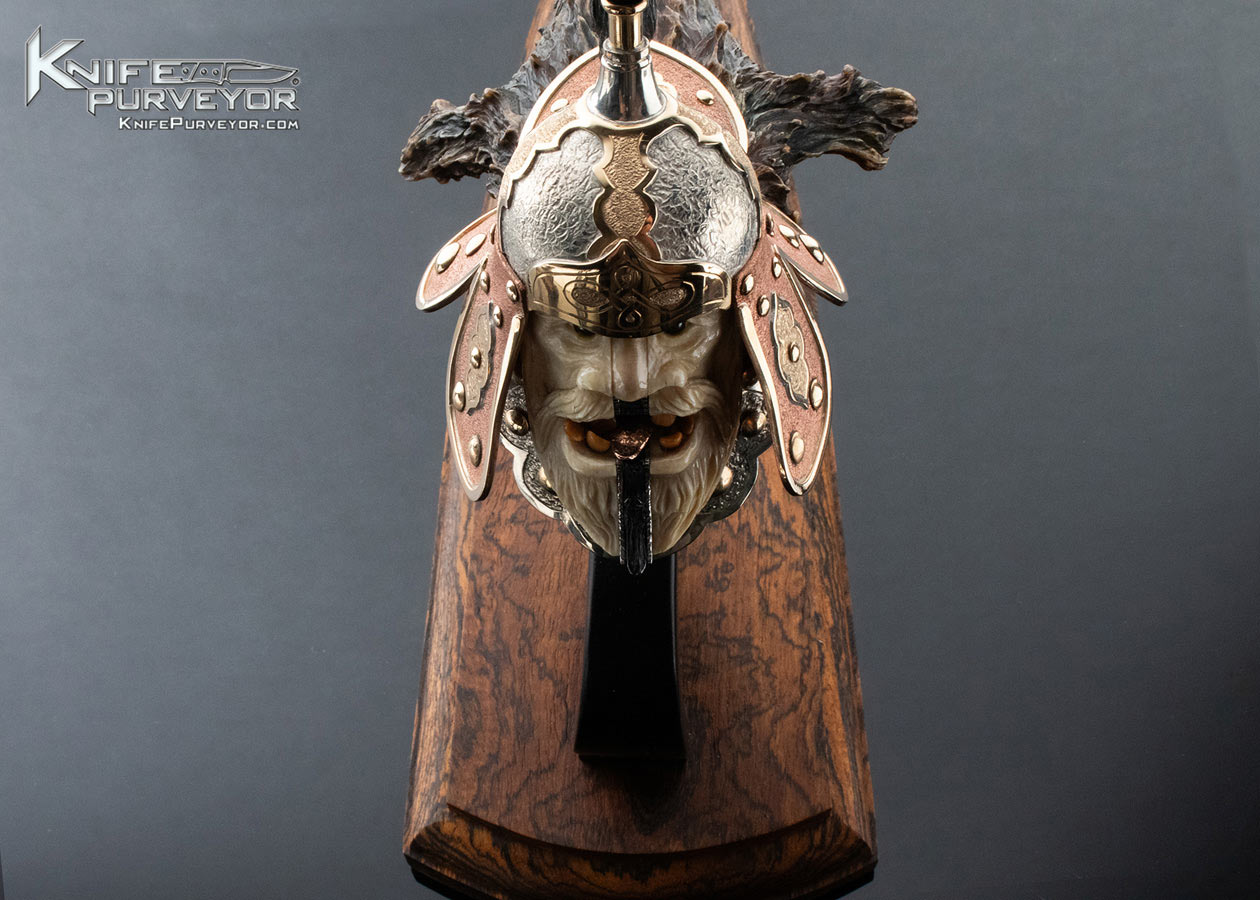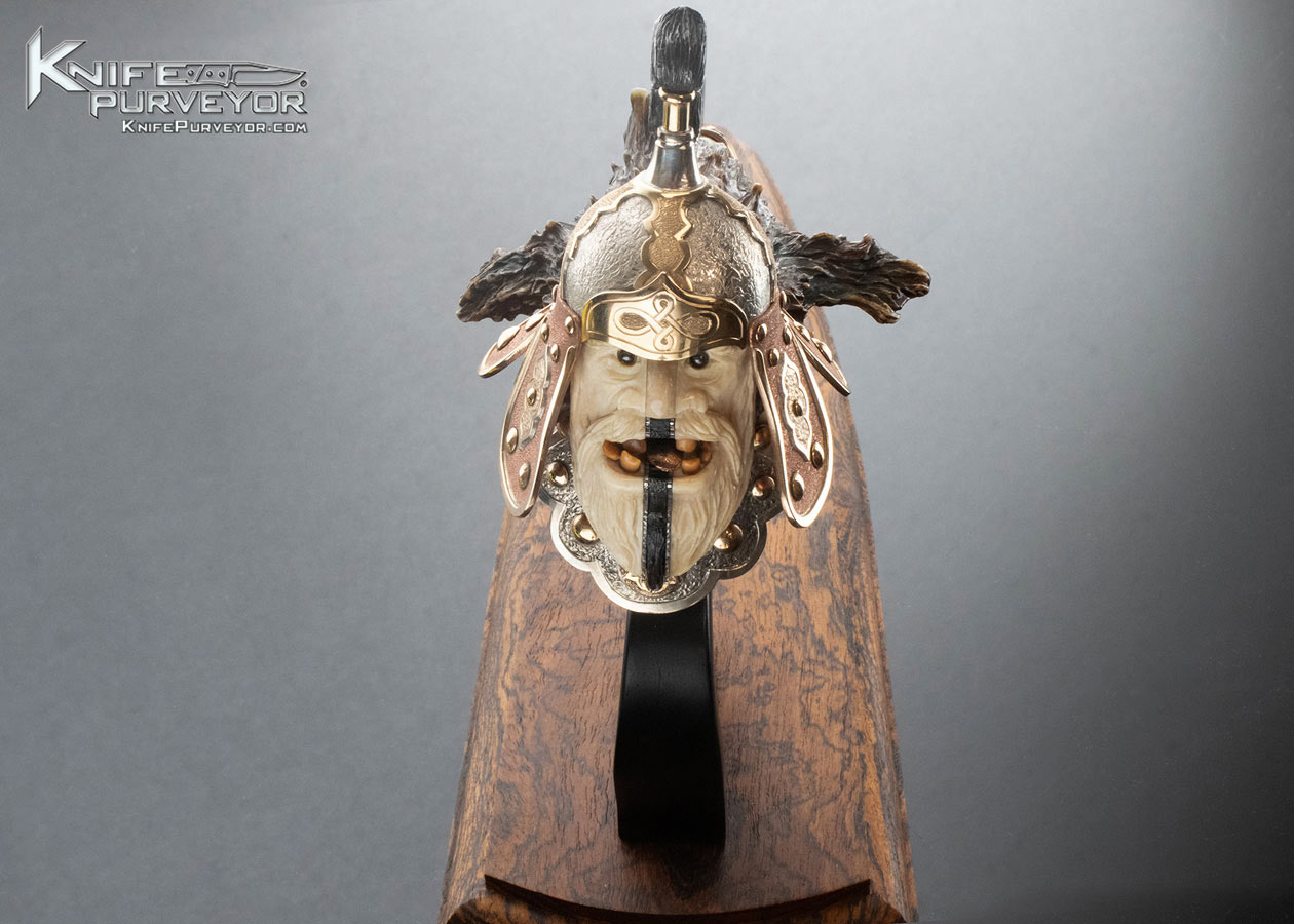 This unique friction folder was inspired by the Mongol warriors from the 13th century. These fierce warriors, with their horses and bows, were an unstoppable force that controlled lands from the Pacific Ocean on the east to the Mediterranean Sea on the west. Many elements of the Mongol warrior have been incorporated into this folder. The helmet is made from hand-formed Sterling Silver and is trimmed with 14Kt Gold. The original neck guards were often made from leather, with metal studs and plates. Larry Fuegen chose to use copper with 14Kt Gold to create the unique neck guard for this helmet. The helmet is topped with a carved blued steel horse hair tassel. The stag handle is carved to represent a heavy fur cape, and the face is carved Mammoth with Fossil Walrus teeth, 14Kt Rose Gold tongue and Hematite eyes. Sterling Silver and 14Kt Gold were used for the throat guard and arm gurads. Hand formed copper bolsters and belts have a brown patina with the 14Kt Gold trim. A fileworked steel spacer and Satinless Steel liners complete the handle. The 5 1/2 inch forged random pattern Damascus blade is a style used by the Mongols and has over 24 inches of inilaid 24Kt Gold wire. The display base is Bocote wood and carved African Blackwood representing a stylized Mongol Bow. Overall Length is 13 1/4". Larry hand crafter over 130 individual pieces to complete this folder, not counting patterns, forms and jigs to make this piece. All work done by maker, Larry Fuegen, ABS Mastersmith.