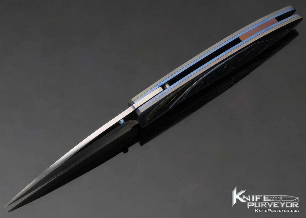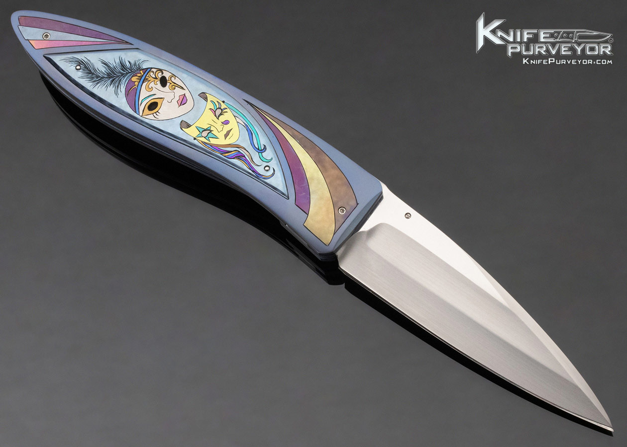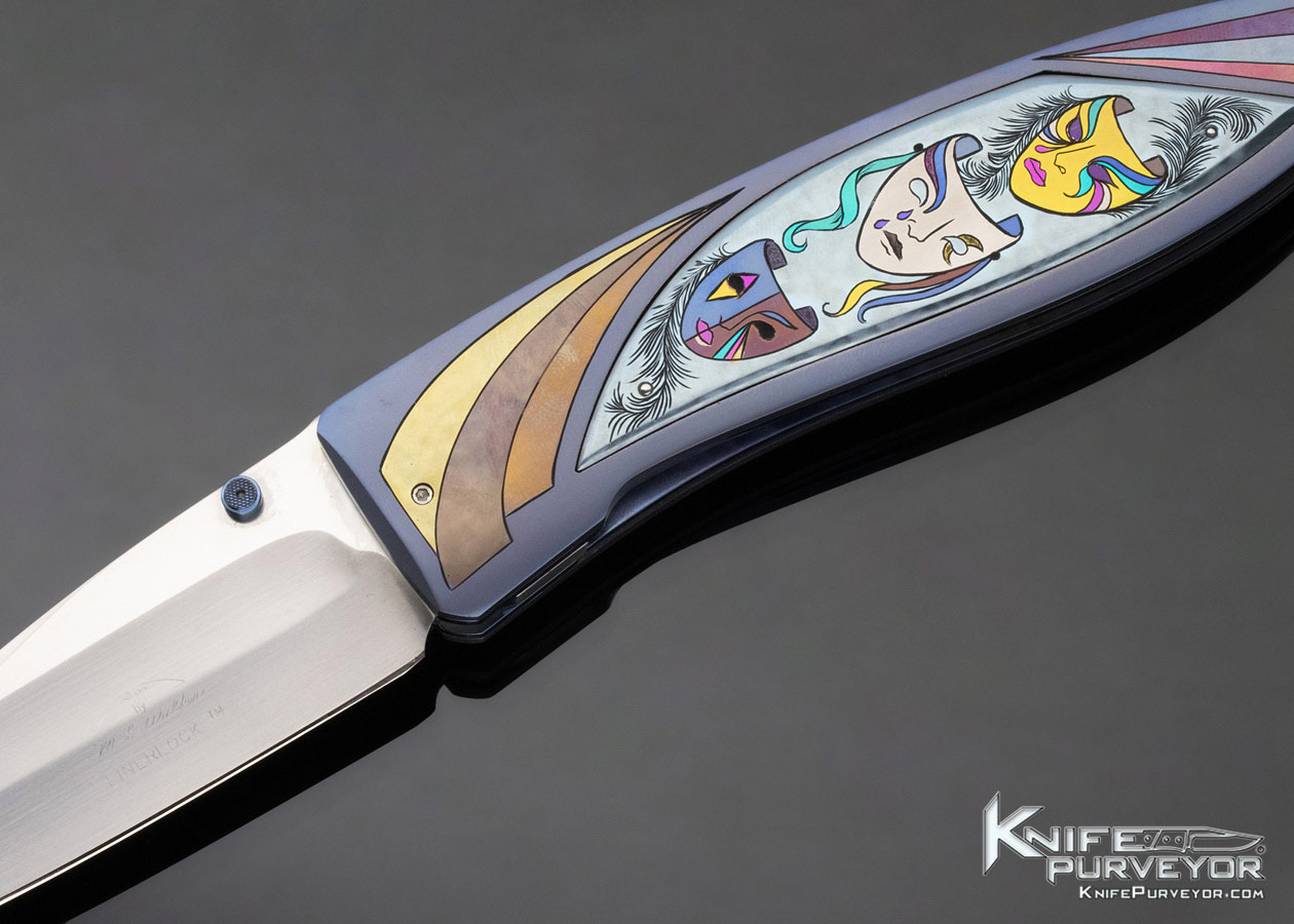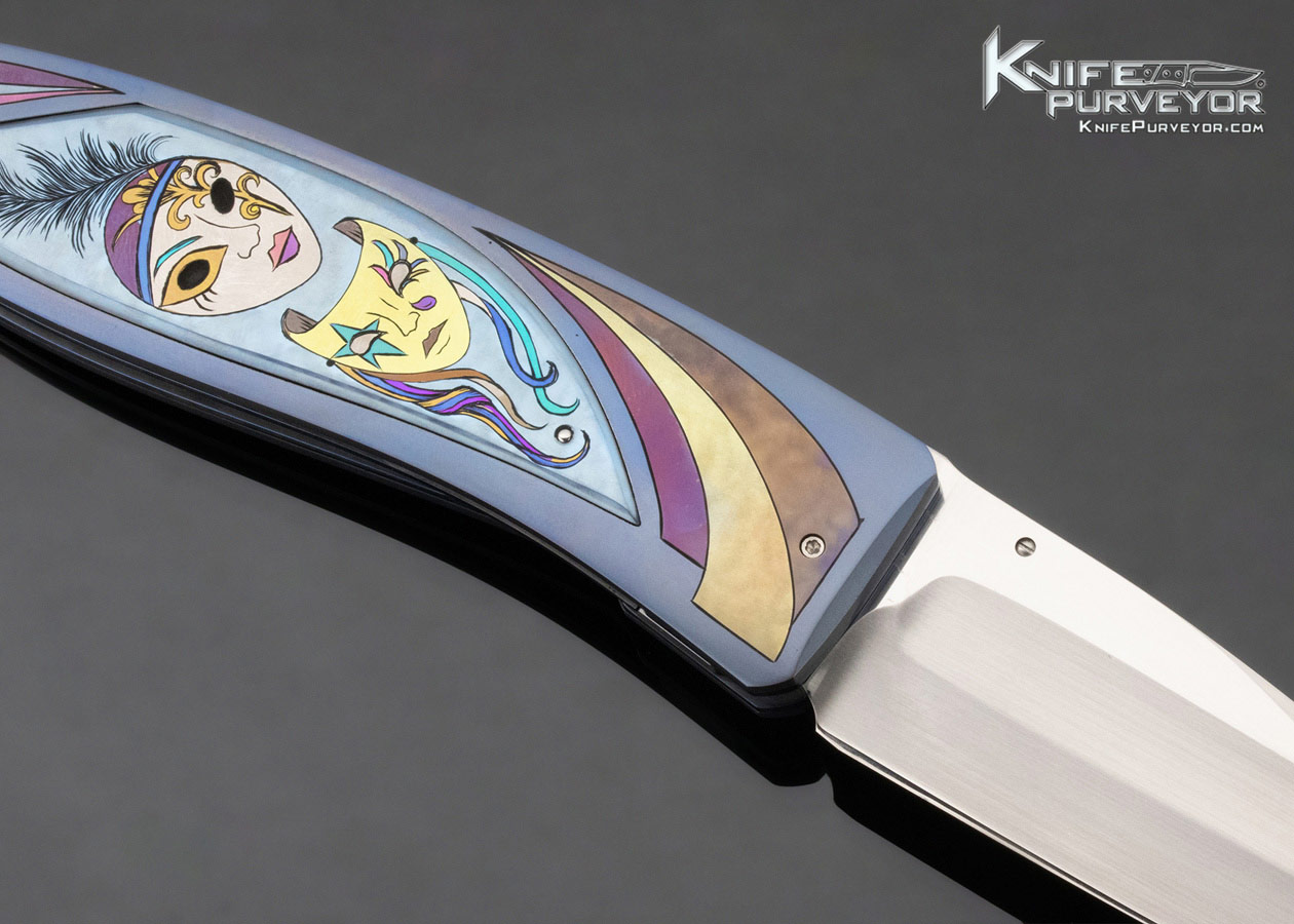Michael Walker Custom Knife “Mardi Gras Mask” Linerlock Engraved by Patricia Walker