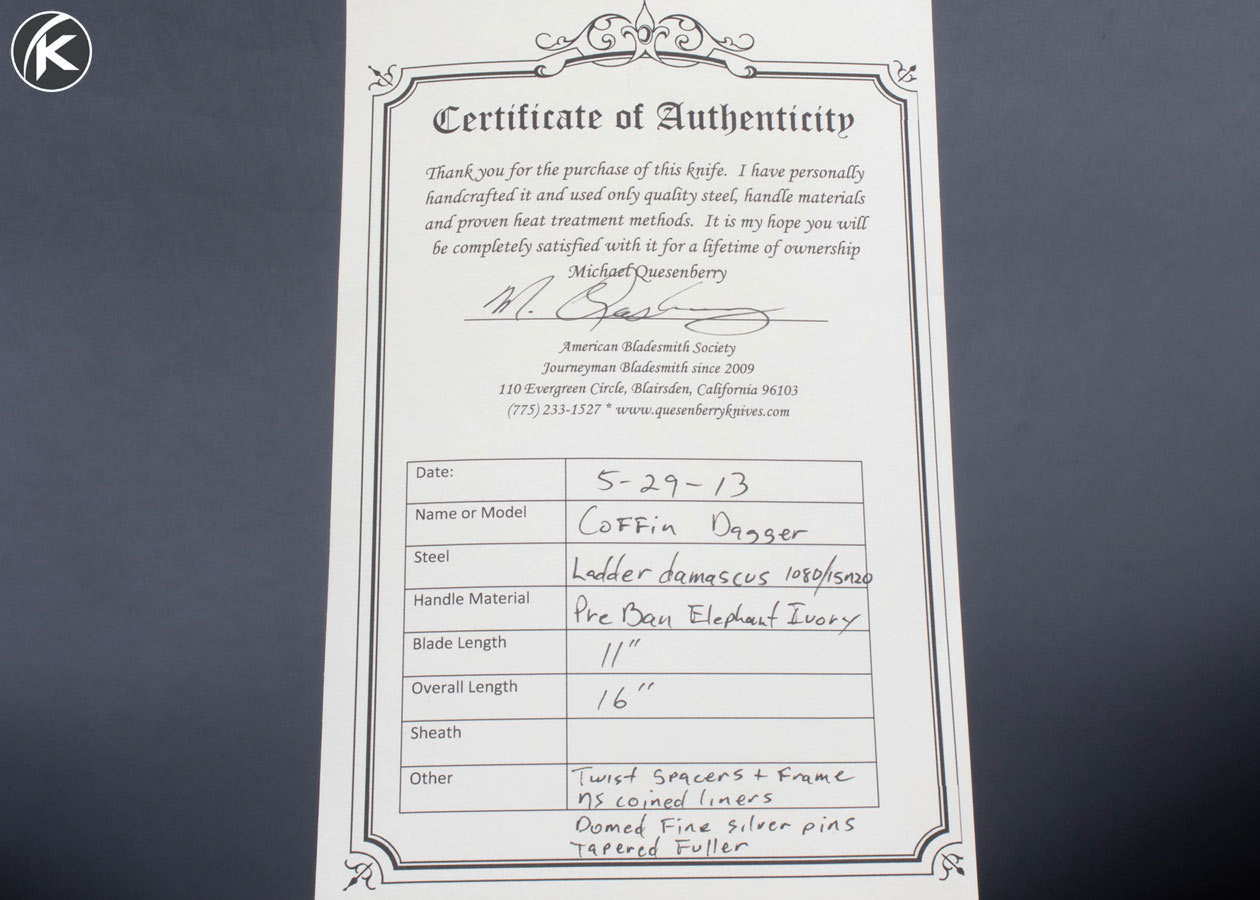 Mike Quesenberry J.S. Custom Knife Sole Authorship Damascus and Mammoth Dagger