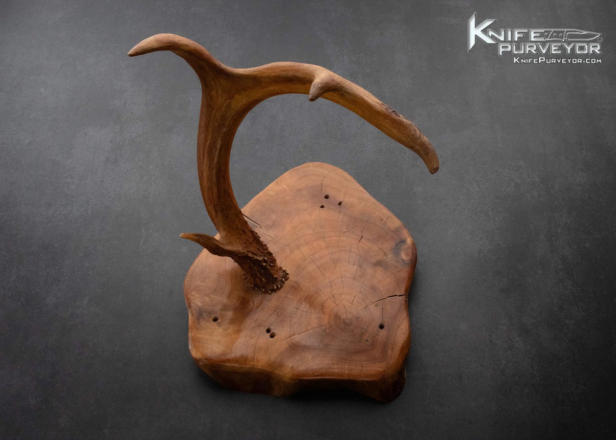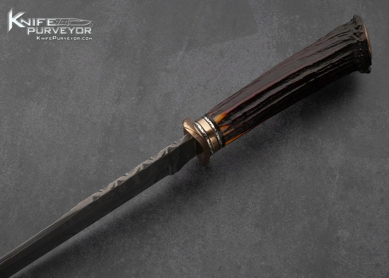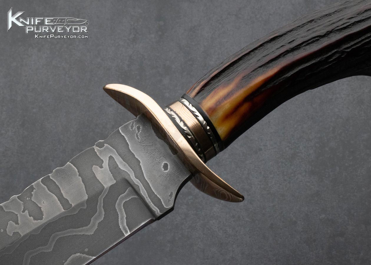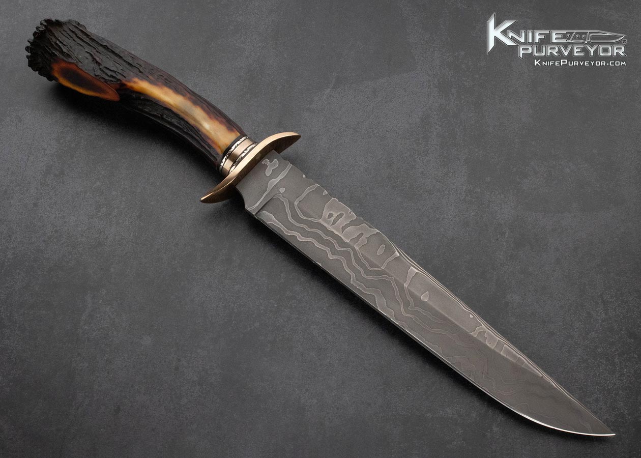 Mike Whiskers Allen Custom Knife Sole Authorship Damascus, Mokume and Amber Stag Bowie with Custom Display Stand