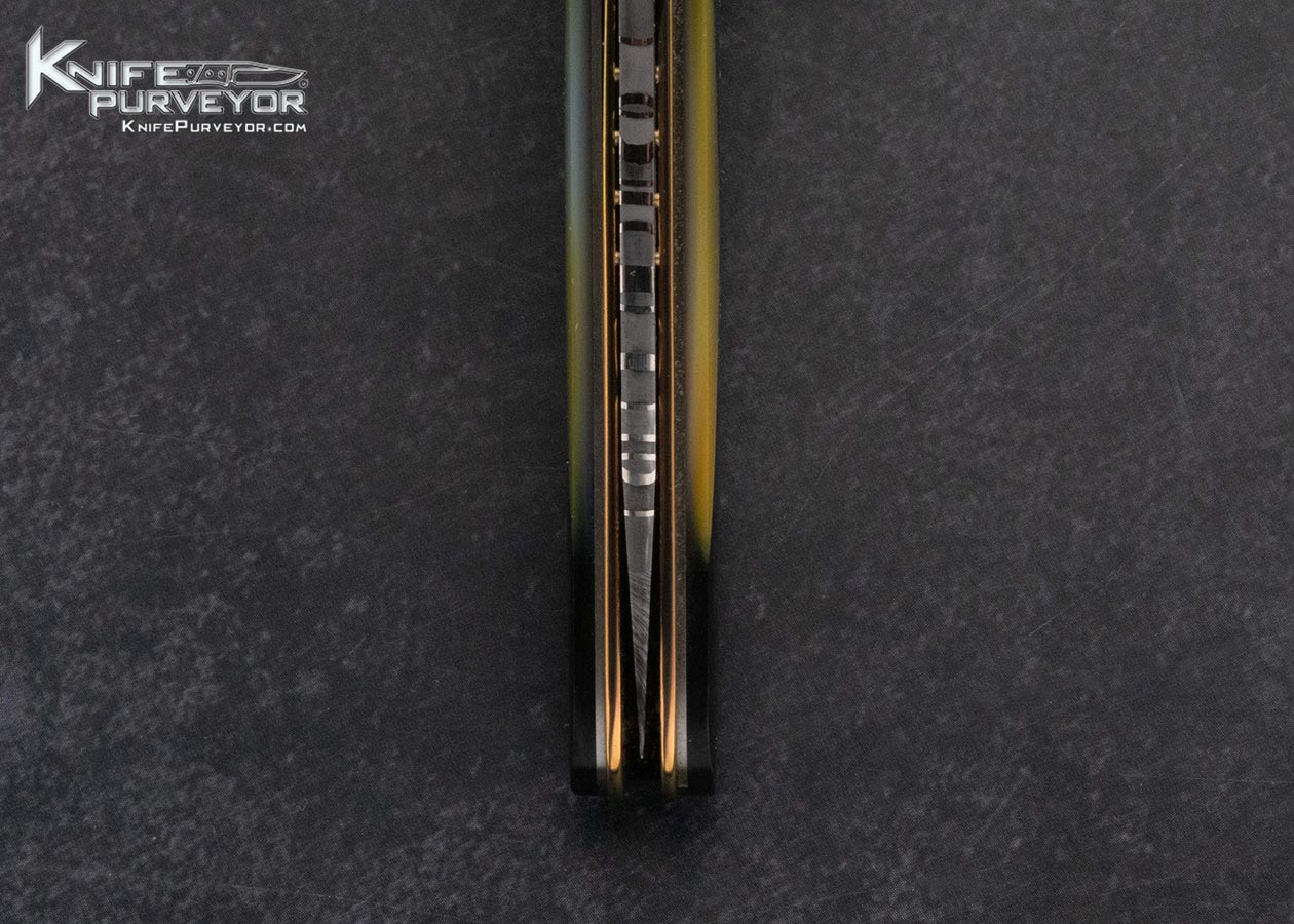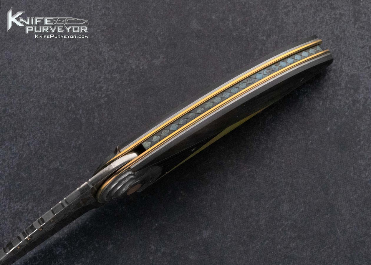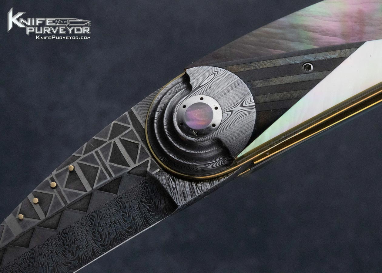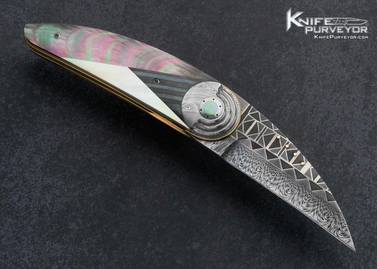 Owen Wood Custom Knife Damascus and Multi Pearl Linerlock Crescent