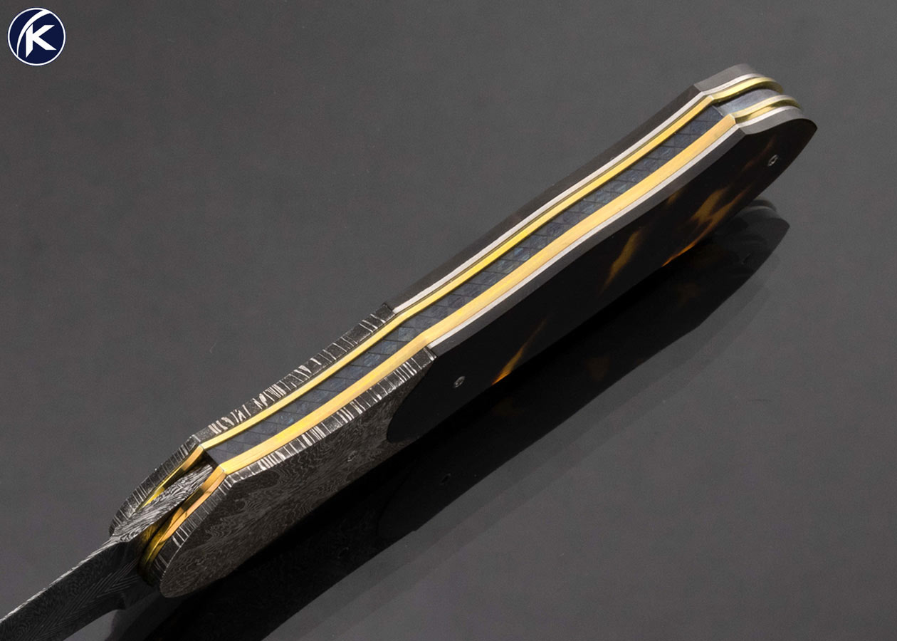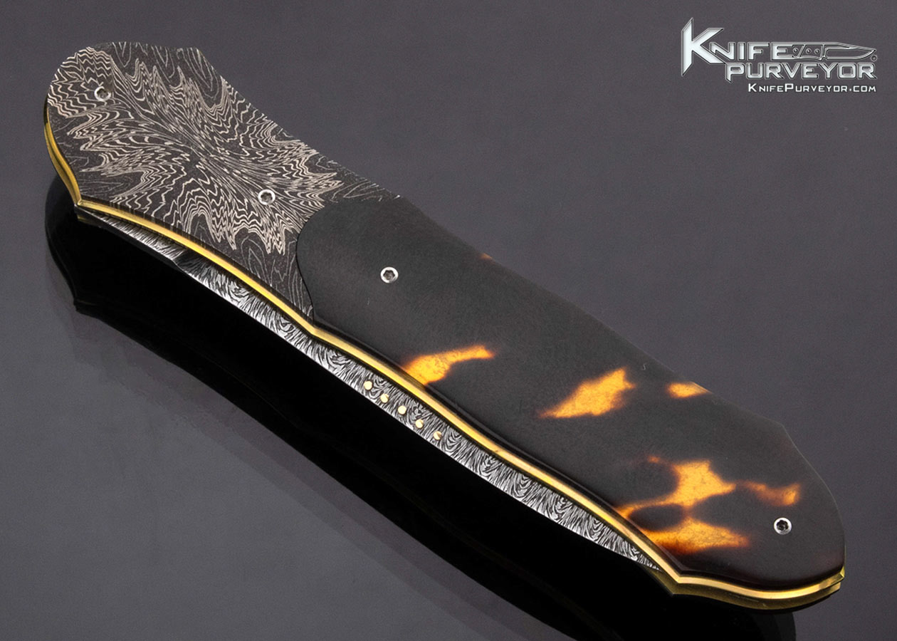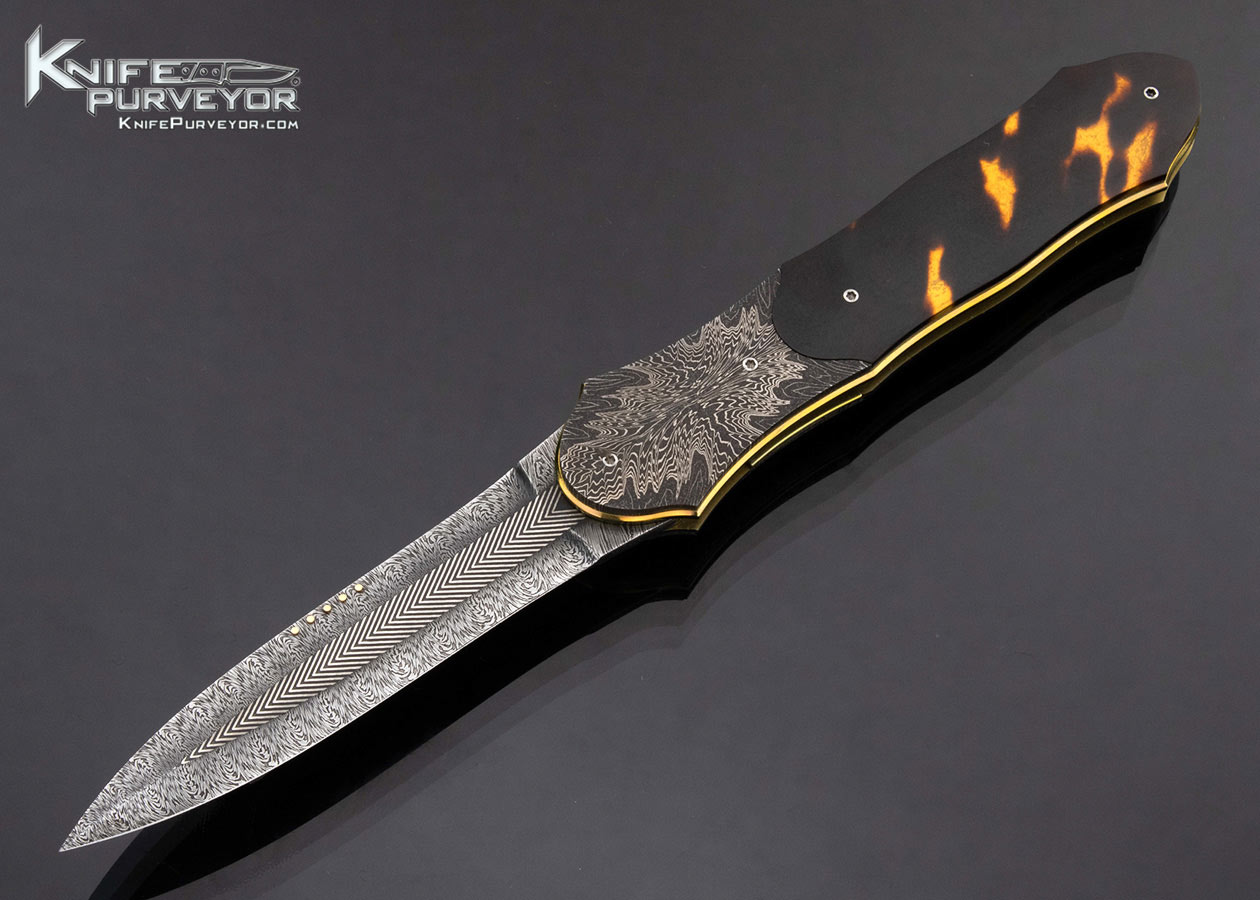 Owen Wood Custom Knife Sole Authorship Damascus Chevron and Explosion Amber Linerlock Dagger