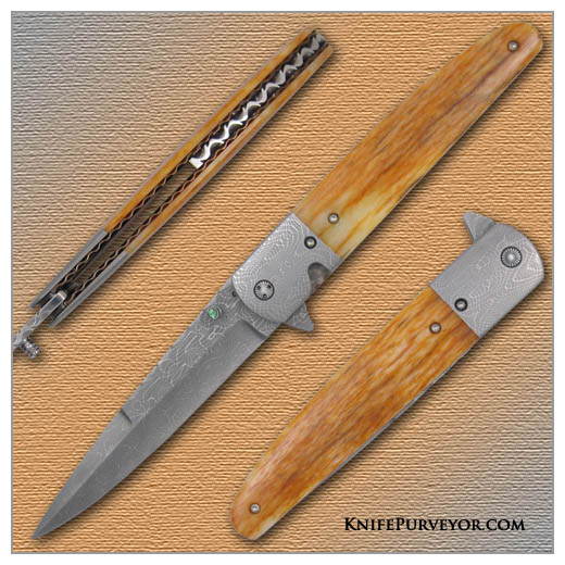 Phil Boguszewski’s Custom Knife: Very Fancy King Asp Damascus Flipper, with Giraffe Bone Scales and Corrugated Liners