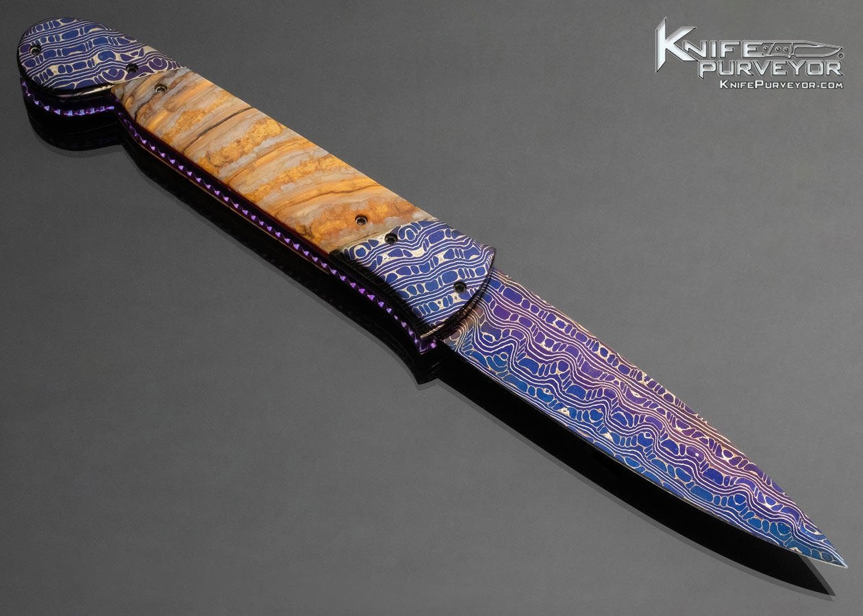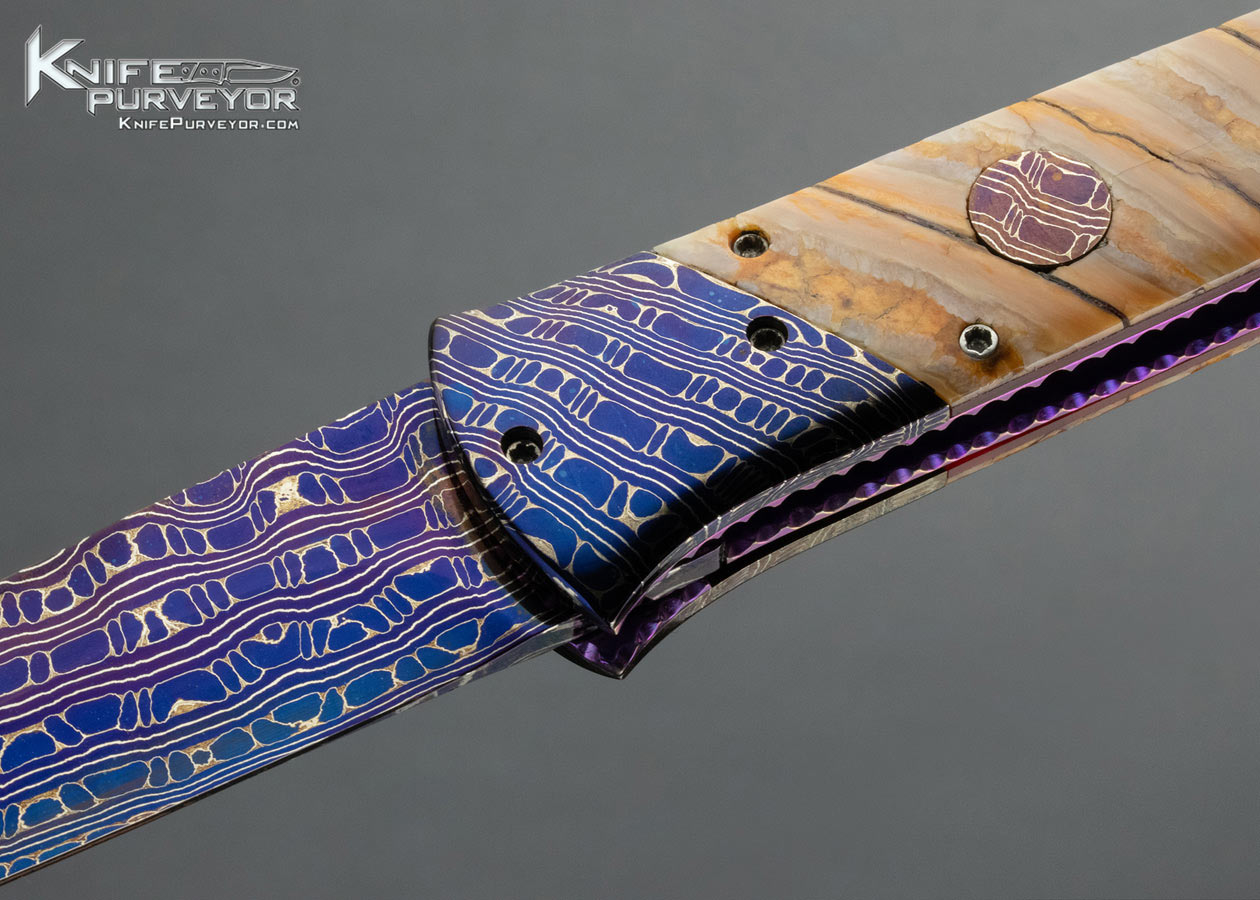 Rainy Vallotton Custom Knife Orange Mammoth Molar Double Bolster Damascus Gambler Automatic Linerlock