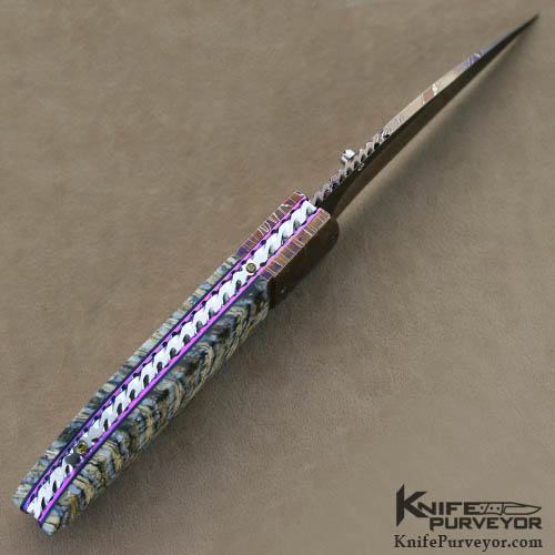 This double action automatic knife was made by Rainy Vallotton. It features Mammoth Tooth scales and blued Chad Nichols Damascus blade and bolsters. There are 2 Citrines set in the fileworked spine surrounded by anodized and fileworked titanium liners. The knife is finished with a Cabochon Sapphire set in the Damascus button release.
