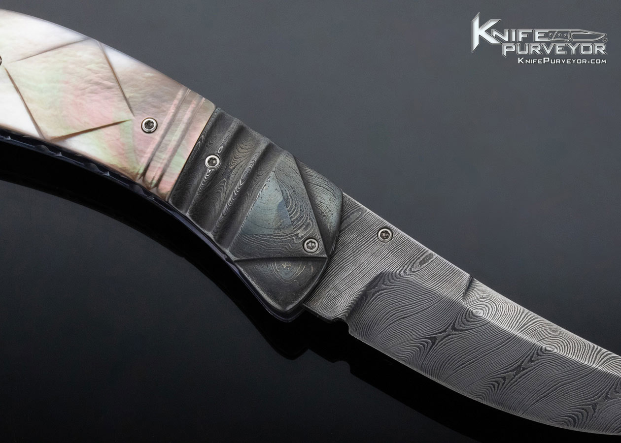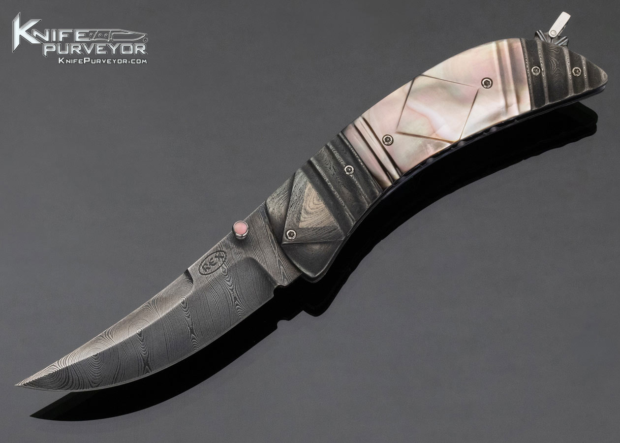 Rex Robinson Custom Knife Damascus and Fluted Black Lip Pearl Linerlock