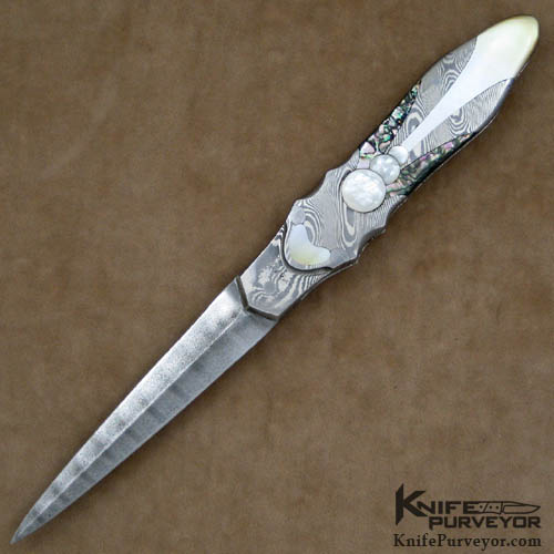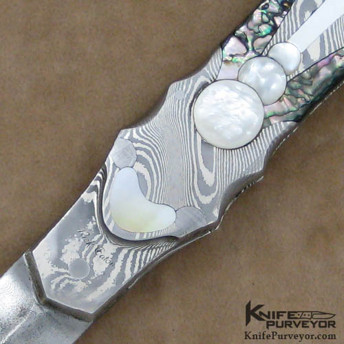 This Art Deco folding dagger was made by Rick Eaton. It features a "Ladder" pattern Damascus blade by Devin Thomas and "Nickel Twist" Damascus handle by Jim Ferguson. Rick Eaton has set 9 inlays on each side of the handle; they consist of Goldlip Pearl, Abalone, Mother of Pearl and Meteorite.