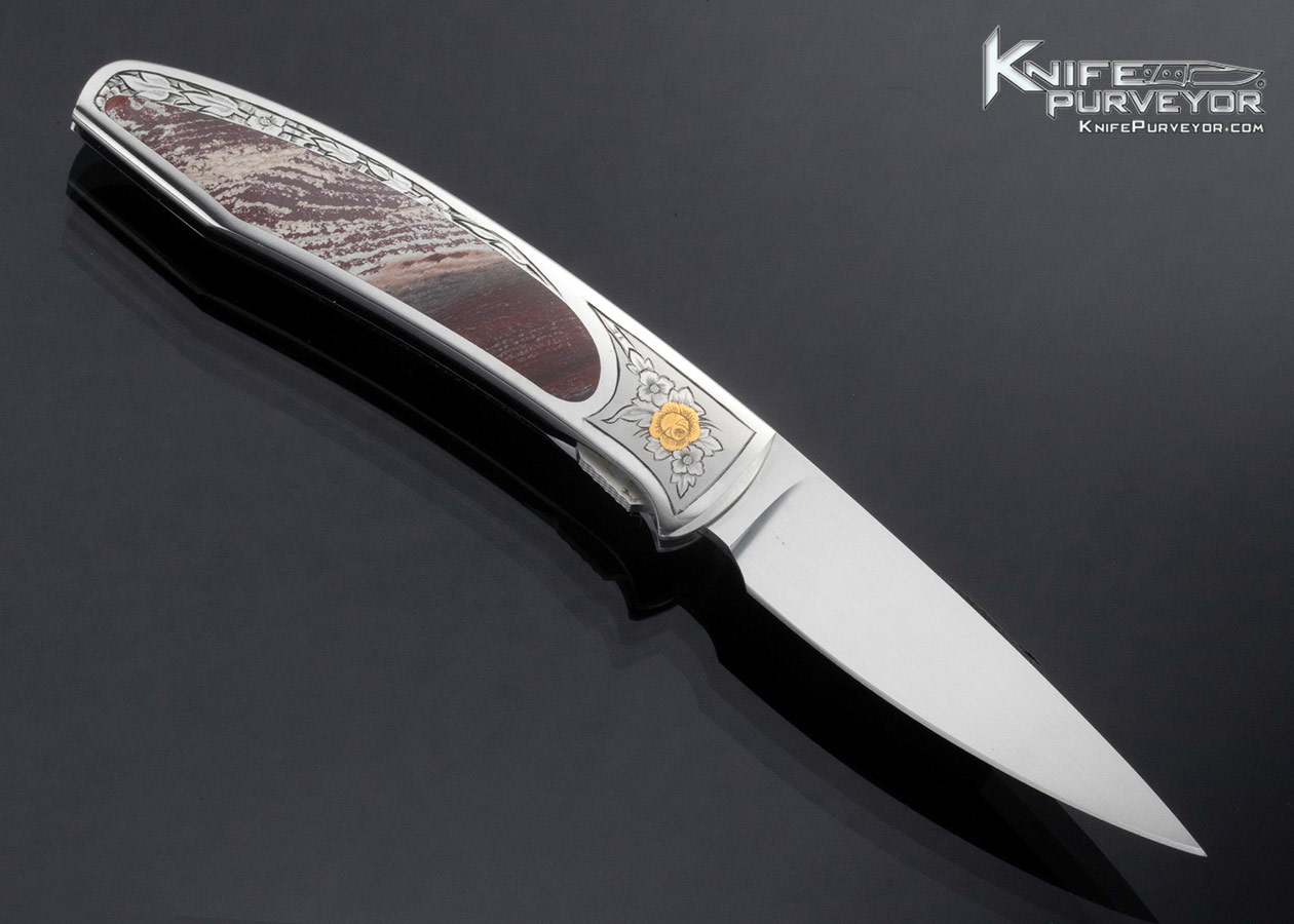 Scott Sawby Custom Knife Jasper Interframe Tern Selflock Engraved by Martin Butler with Gold Inlays