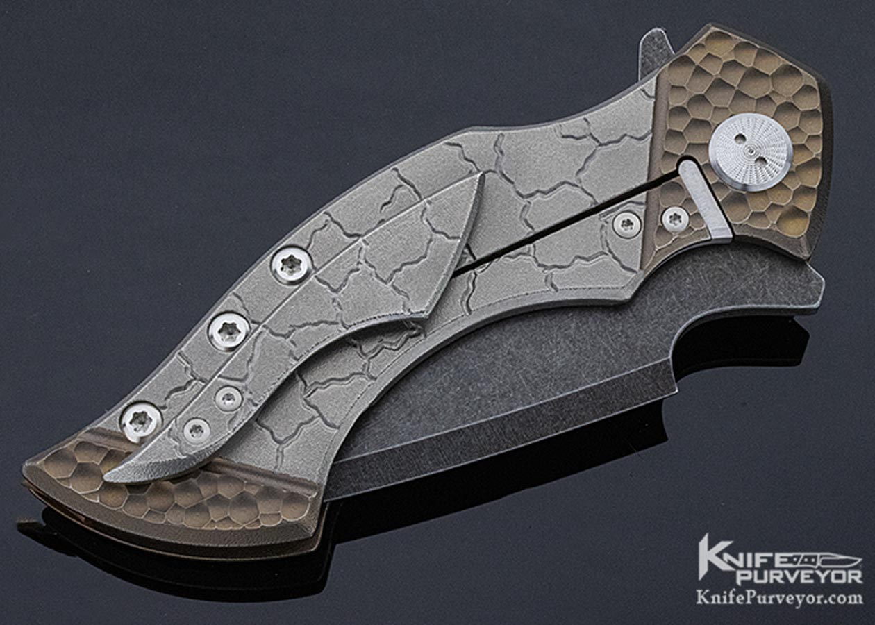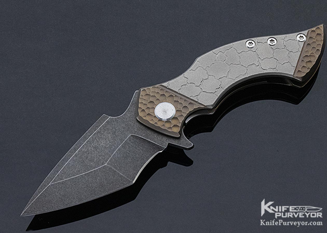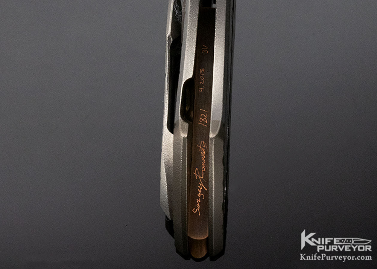 Sergey Rogovets (Extreme Addiction) Viper #1821. As a jeweler by training, Sergey prides himself on no CNC or other automated processes being used in his knife making. This knife is completely made by his hands with almost surgical precision. The "cracked earth" pattern on the titanium handles and the "scallops" on the faux copper bolsters are hand carved by the maker. If you look closely at the pocket clip, you will see that it has the same pattern as the portion of the handle it covers. The "bamboo" backspacer is hand carved from a solid piece of copper with fine detail and signed be Sergey on the underside. All patina and finishes on this knife are hand applied, it is not simply anodized. The blade is hand ground. Sergey makes tactical knife art but function comes first and the Viper fits the hand perfectly as a tool meant to be used. A great knife from an underpriced maker. It includes his large branded Pelican presentation case, pouch, and tool.
