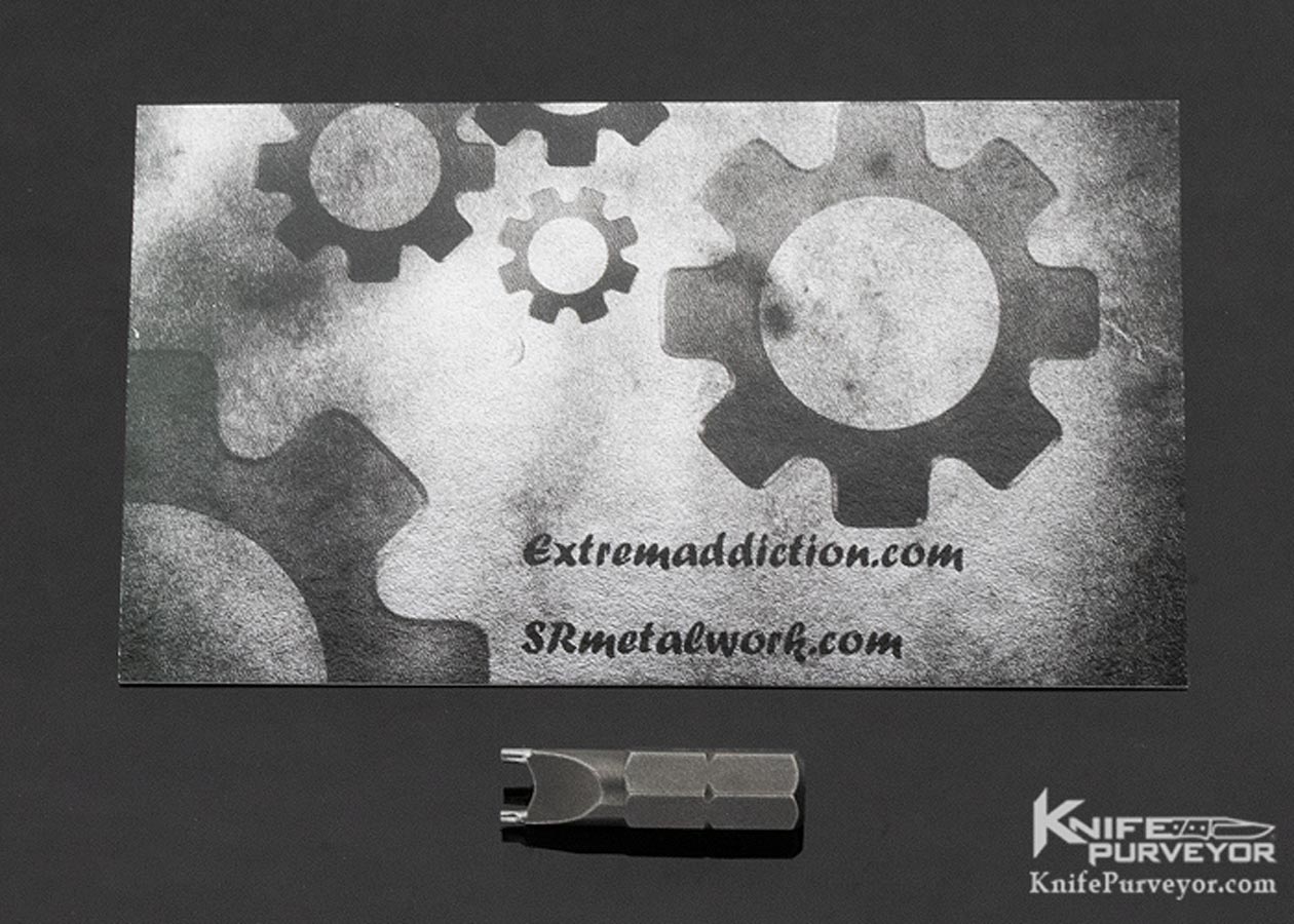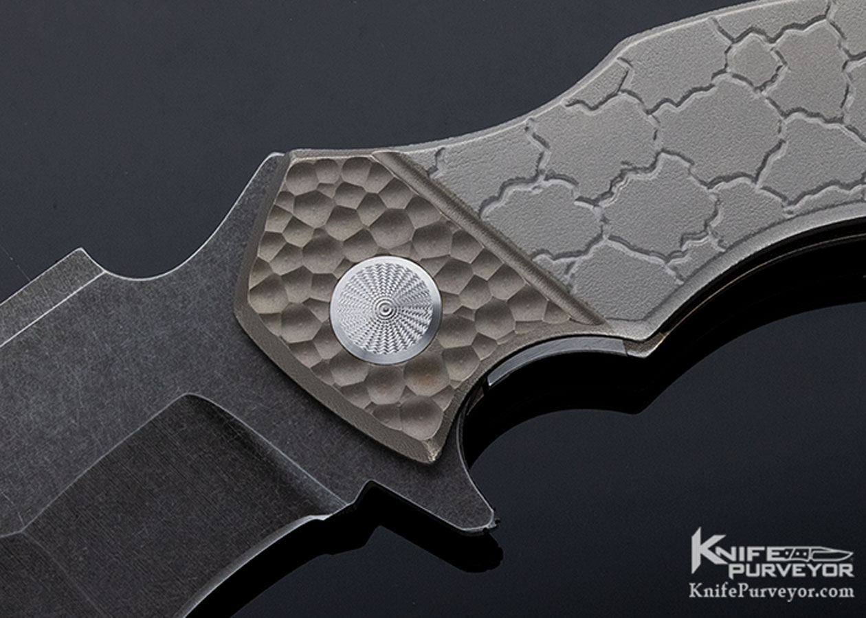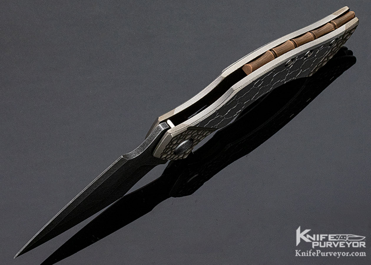 Sergey Rogovets (Extreme Addiction) Viper #1821. As a jeweler by training, Sergey prides himself on no CNC or other automated processes being used in his knife making. This knife is completely made by his hands with almost surgical precision. The "cracked earth" pattern on the titanium handles and the "scallops" on the faux copper bolsters are hand carved by the maker. If you look closely at the pocket clip, you will see that it has the same pattern as the portion of the handle it covers. The "bamboo" backspacer is hand carved from a solid piece of copper with fine detail and signed be Sergey on the underside. All patina and finishes on this knife are hand applied, it is not simply anodized. The blade is hand ground. Sergey makes tactical knife art but function comes first and the Viper fits the hand perfectly as a tool meant to be used. A great knife from an underpriced maker. It includes his large branded Pelican presentation case, pouch, and tool.