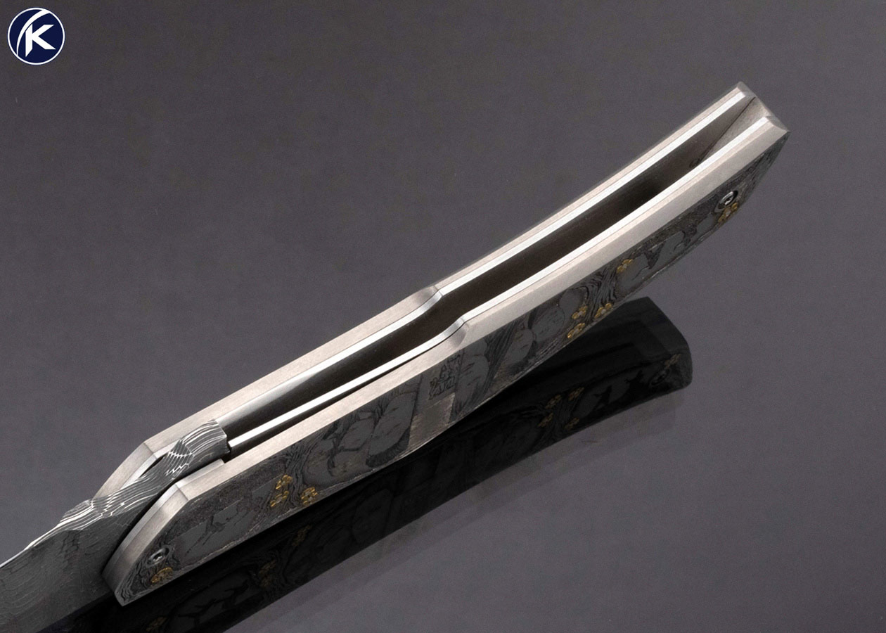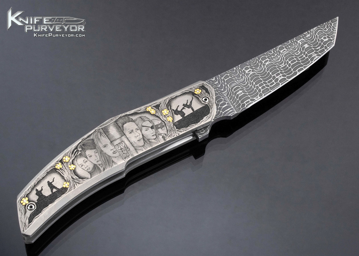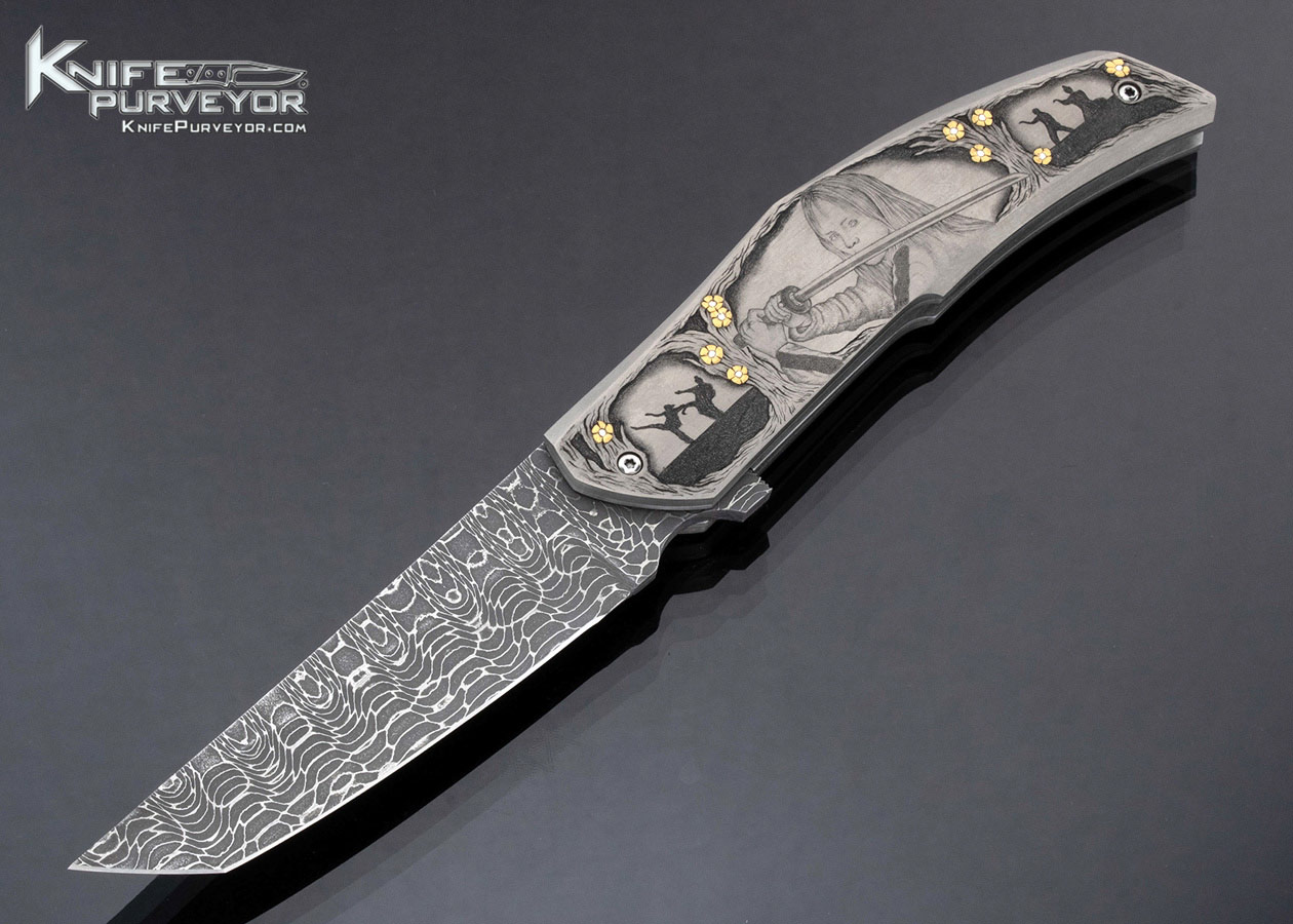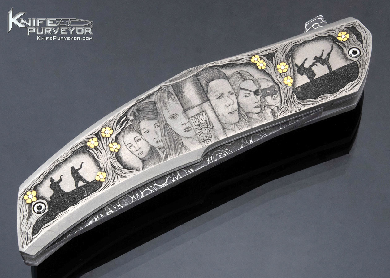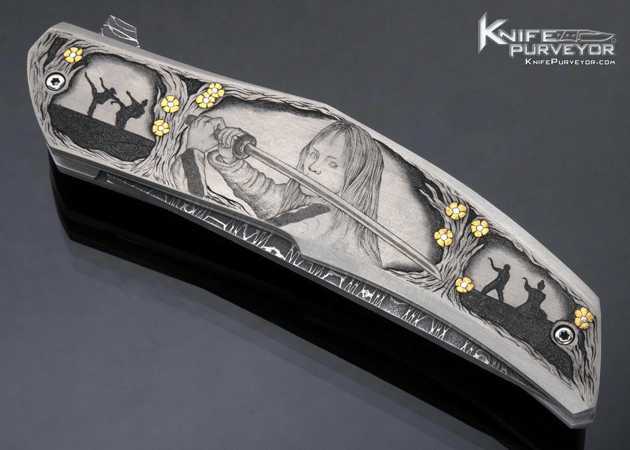 Sergio Consoli Custom Knife Damascus Flipper Linerlock Engraved by Fabio Bregoli with Kill-Bill Style Motif and 24Kt Gold Inlays