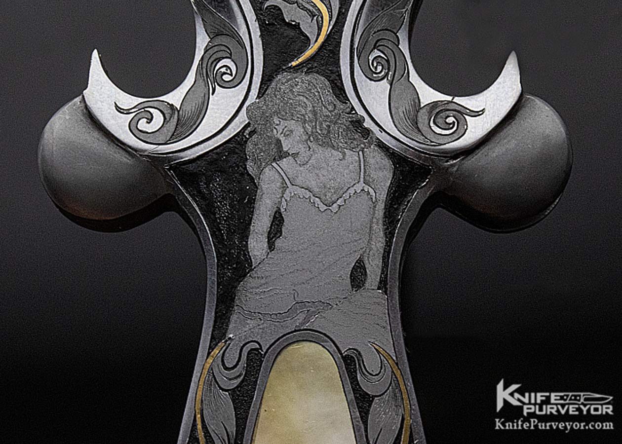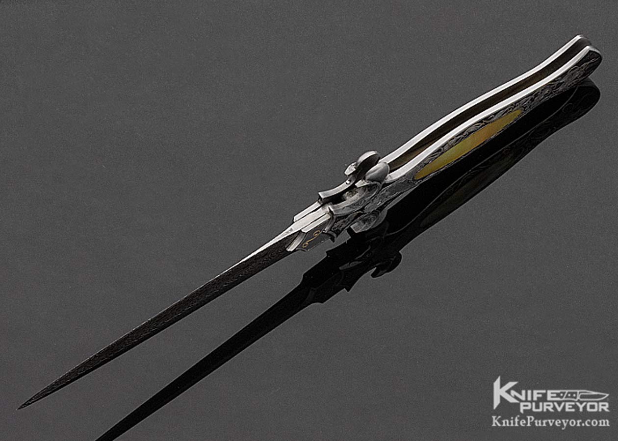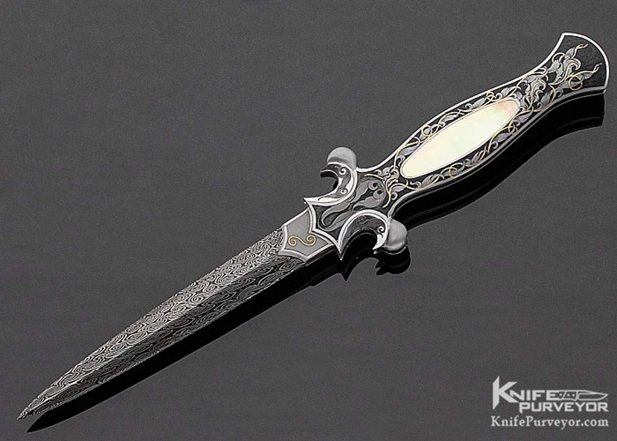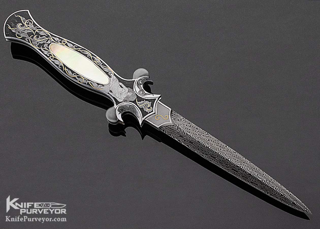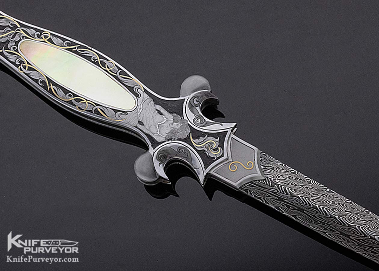 Shaun & Sharla Hansen Custom Knife South Sea Gold Lip Pearl Interframe Engraved Damascus Automatic Dagger