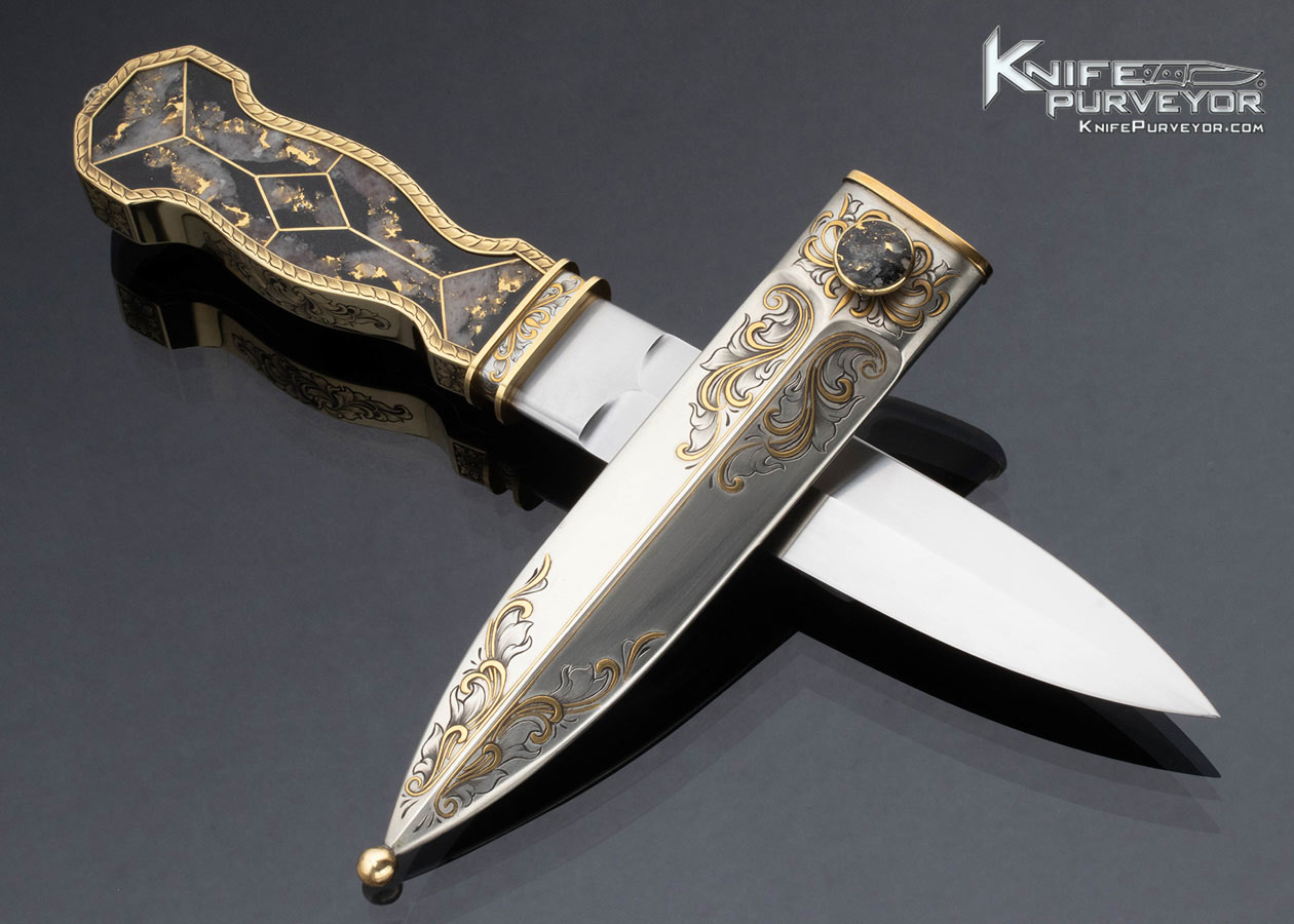 Added to this value is that the knife and scabbard have been hand engraved by Master Engraver Julie Warenski. Julie has hand inlaid 24Kt Gold into the guard and scabbard. The scabbard is finished with a Gold Quartz 18Kt Gold Frog, 18Kt Gold Ball and Throat. Capitalize on this opportunity to add this Masterpiece to your collection.