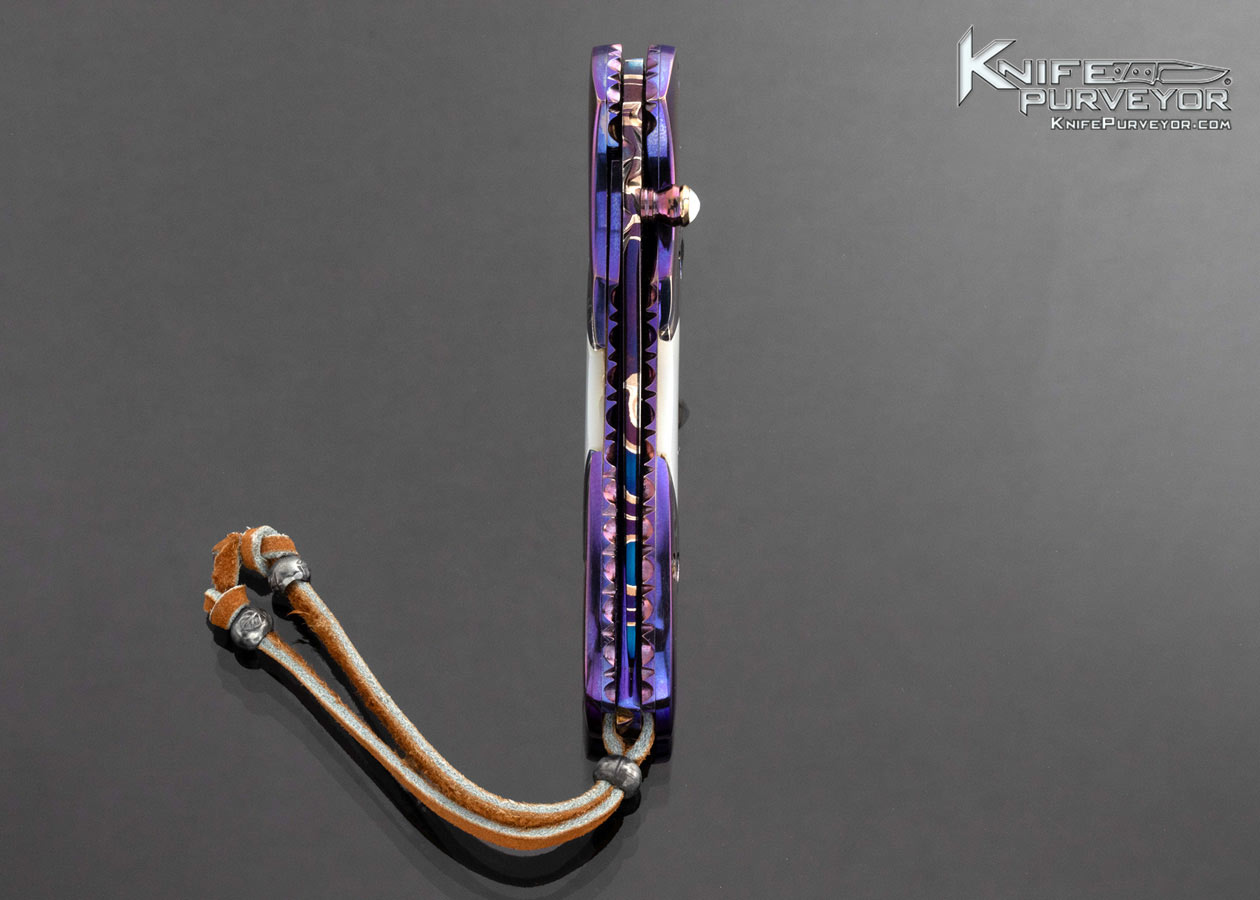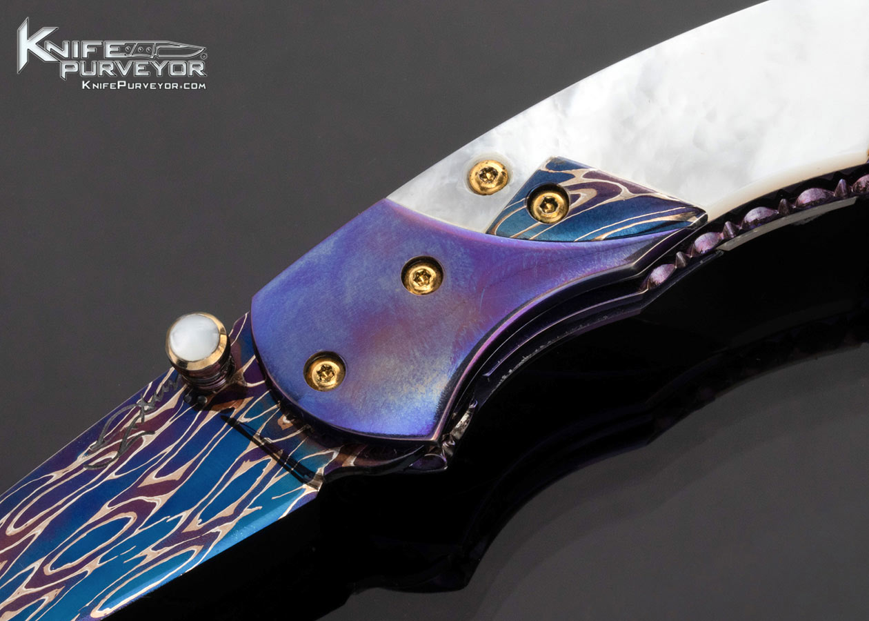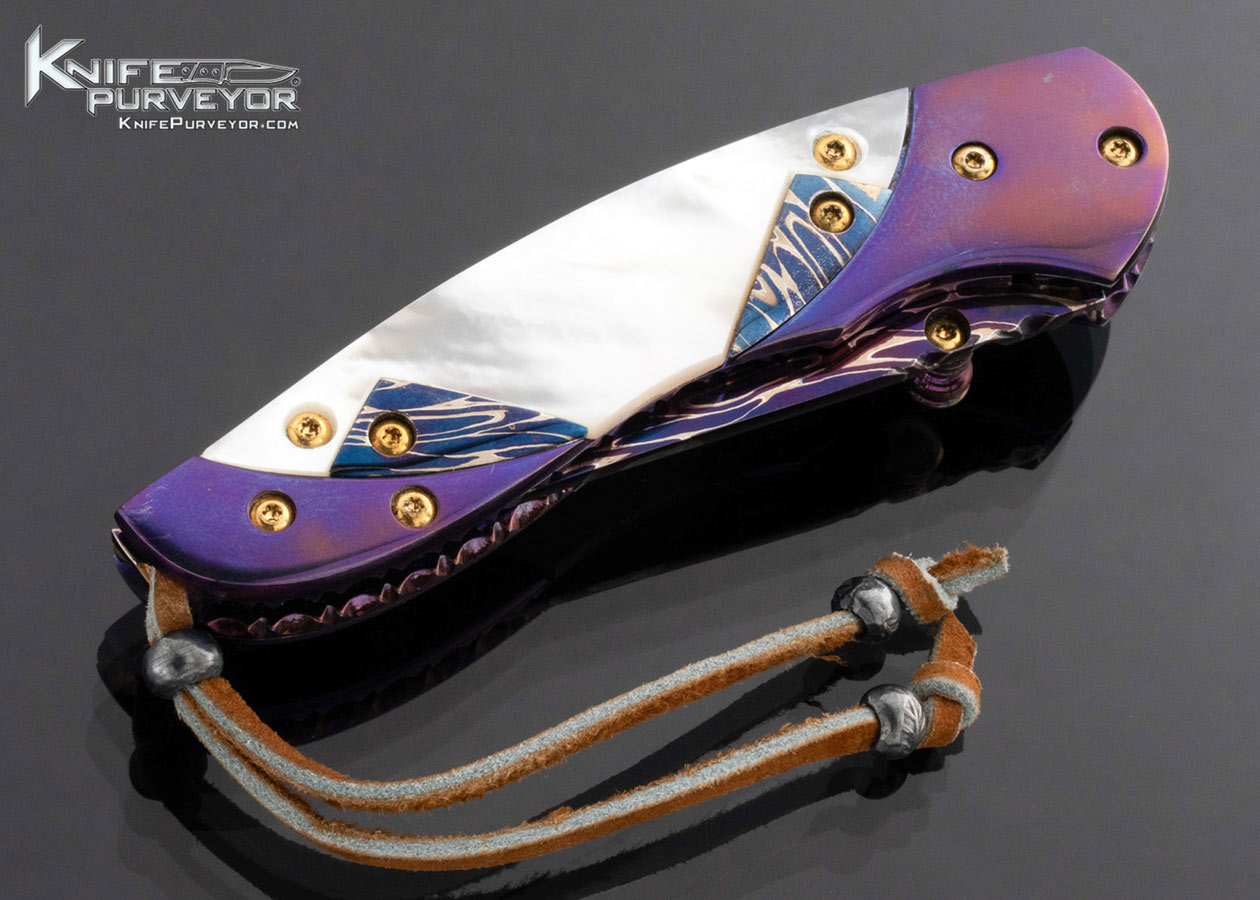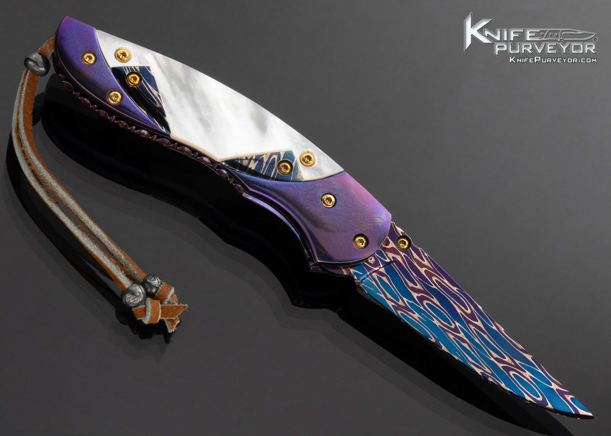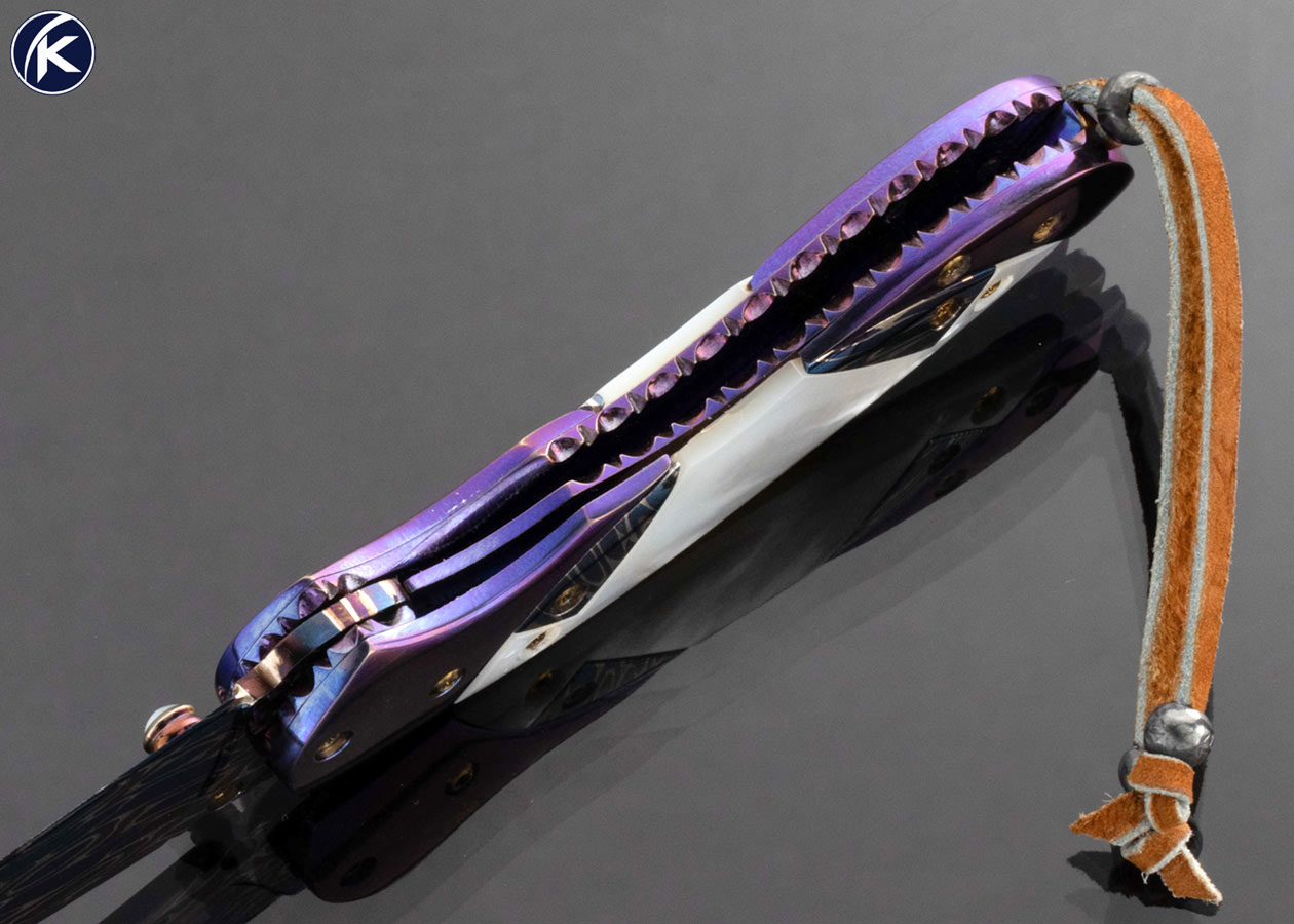 Suchat Jangtanong Custom Knife Blued Damascus Mother of Pearl Linerlock with Leather Lanyard